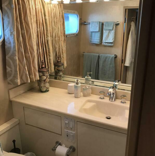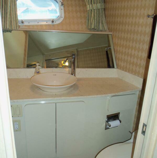 Aft, outside of the cabin, is the Crew Head with a marble topped vanity, above counter vessel sink, medicine cabinet, Microphor head and a stall shower with a bi fold glass door. This head serves the entire Crew Area.