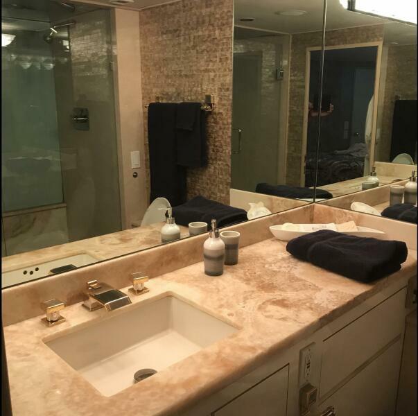 The toilet is a Microphor model. Inboard is a Jacuzzi tub with a shower fixture. There are marble framed mirrors fore and aft of the tub. Also in the head are six accent lights around the mirror, three overhead mini spots, a GFCI outlet and a ventilation fan.