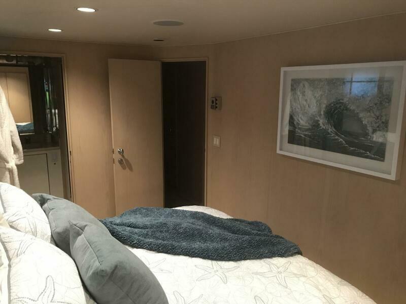 Entered from the aft end the king size berth is arranged athwartship off the outboard bulkhead. Both fore and aft of the berth are large three drawer nightstands. Outboard of the berth are two opening portholes behind sliding Soji screens. Aft is a hinged door into a walk in cedar lined hanging locker plus an adjacent 42” Samsung TV with two cabinet doors below for A/V equipment including a Denon AV/AM/FM/CD receiver, an Isotherm drink fridge and a digital safe. Forward is the entrance in the private head.