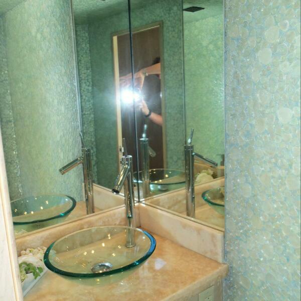 The Day Head has been updated to have glass tile walls, an onyx countertop and an above counter glass vessel sink with vanity storage below. Above the vanity is a three sided mirror.