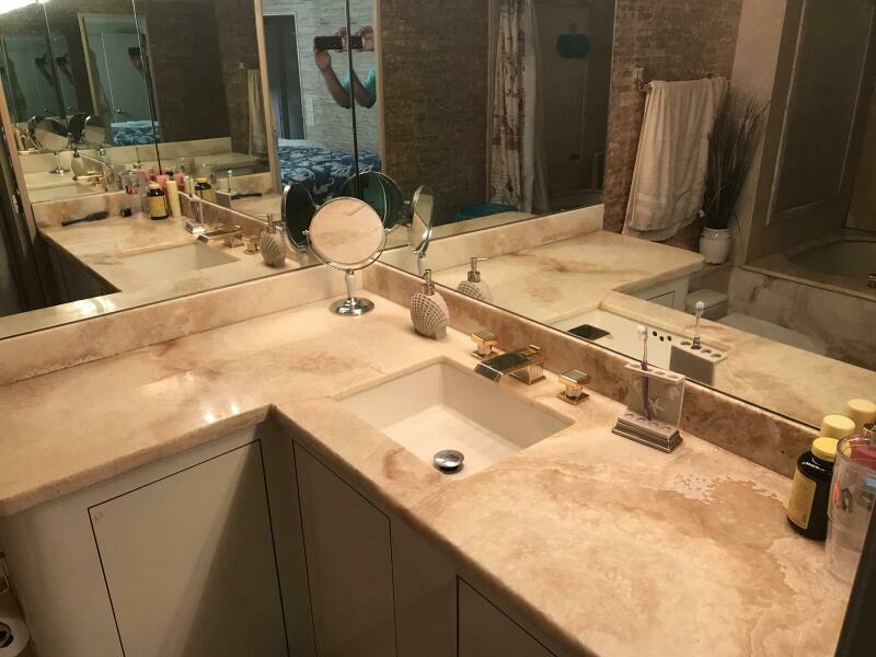 The private head has a marble tile sole and a vanity with two cabinet doors and three drawers below. The onyx countertop has an undermount china sink and a two tone fixture above. There are three sides of mirrors around the countertop.