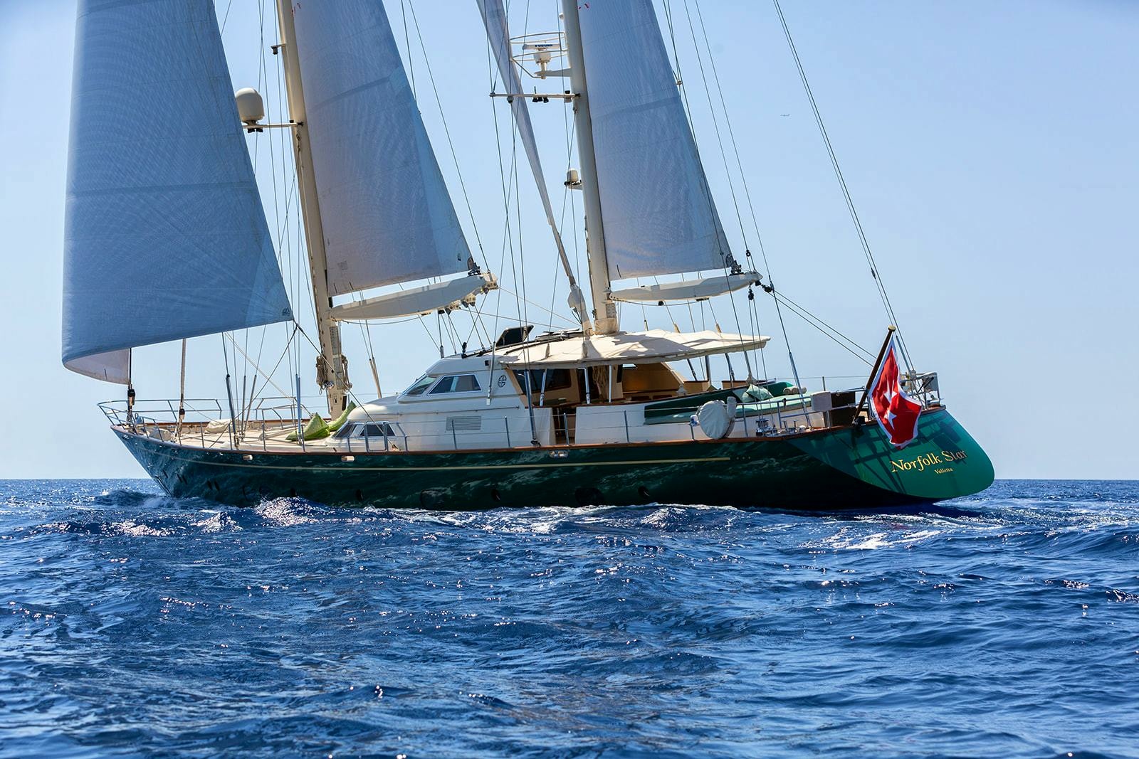 | The 37m Perini Navi NORFOLK STAR is a proven world cruiser, having completed more than three circumnavigations. Her Perini design with a versatile ketch rig and ample space both above and below deck makes her ideal for a luxury live-aboard lifestyle with excellent charter potential. With a sleek steel hull and a cruising speed of 11.4 knots, she offers both performance and elegance. Following an extensive refit in 2019/20, she now boasts new Doyle Carbon-Spectra sails, BSI Rod rigging, and a full Awlgrip paint job. Upgrades include a Volvo Penta D13 engine, Kohler 55kW generators, HEM watermakers, and advanced communication systems. NORFOLK STAR's interior is luxurious, featuring Cherry Wood finishes and ample natural light. The contemporary yet timeless style creates a calming ambiance. The bridge offers excellent 360-degree visibility and lots of skylights while the upper salon offers comfortable seating and panoramic views and the lower saloon includes a formal dining area. The spacious galley is equipped with modern amenities. Accommodating up to seven guests, NORFOLK STAR has three beautifully appointed cabins. The full-beam master stateroom includes a king-sized bed, walk-in wardrobe, and en-suite bathroom with marble finishes. Two additional cabins feature twin beds and a Pullman berth, with en-suite bathrooms and stylish décor. The exterior design balances form and function, with a main deck divided into comfortable areas for relaxation and alfresco dining. The aft deck features a cushioned sunbathing area, while the foredeck offers ample lounging space. Additional features include a large boarding ladder and a new Williams 505 tender among her tenders and toys. |
