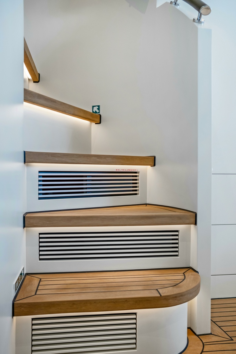- MarQuipt 9-step aluminum side boarding sea stair (incl. FRP storage box) w/ x2 long handrails.