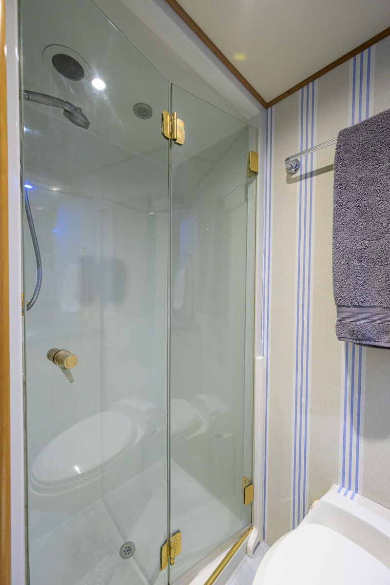 Entrance to the salon is either through double stainless steel sliding glass doors from the aft deck, or through port and starboard sliding Freeman doors from the side decks. The predominant side entrance is to starboard - opening into a porcelain-floored entryway with a stairway down to the guest staterooms and up to the Skylounge. The Owners' cabin, galley, and powder room are forward.