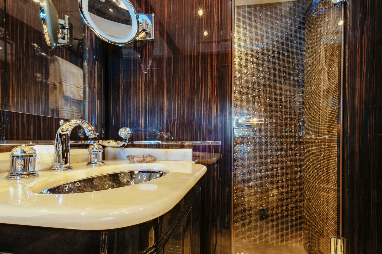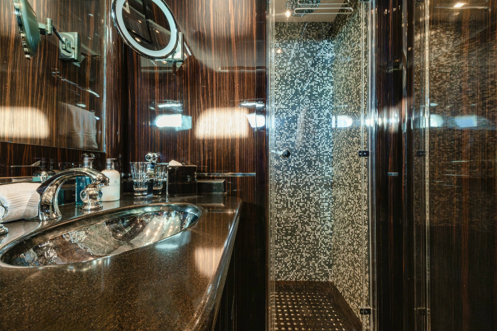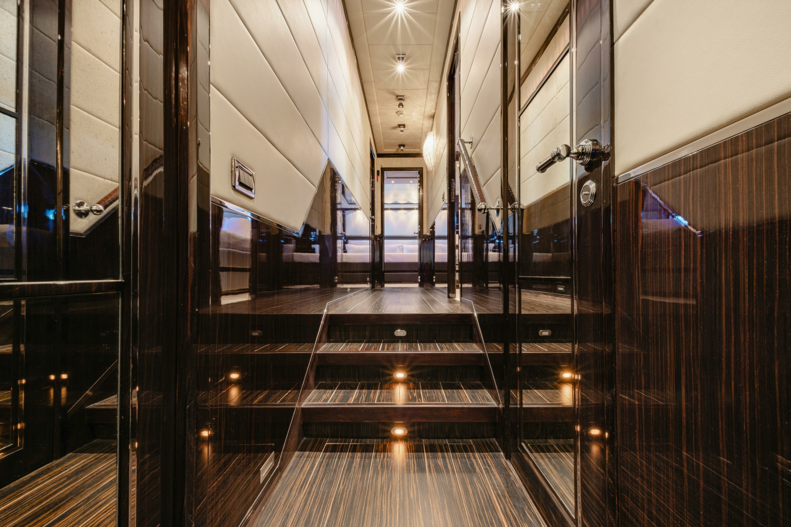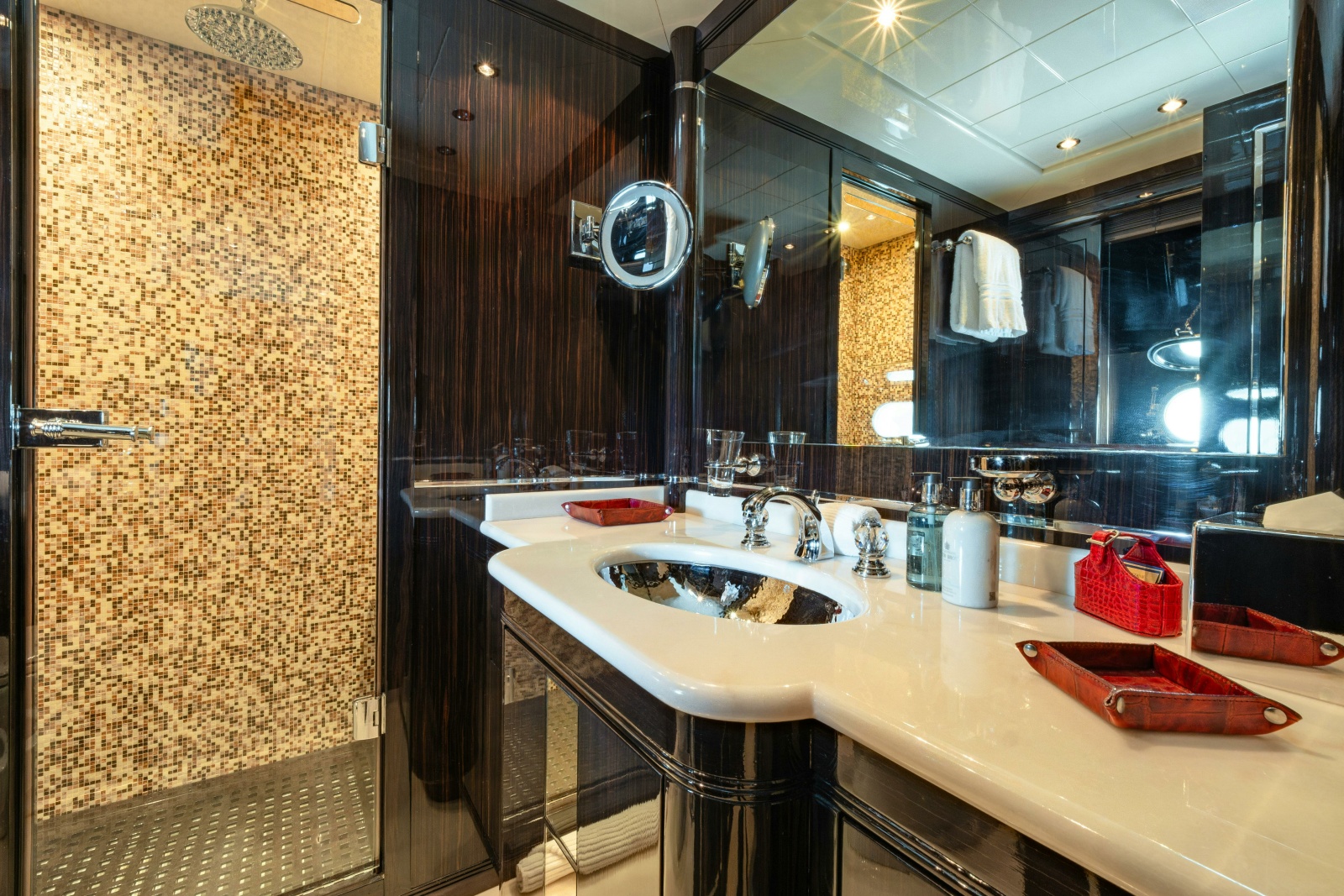 - Full beam owner’s suite aft features a large double bed, spacious seating area and large amounts of storage and hanging spaces. There is a separate office and a large owners bathroom featuring his and hers sinks and Hammam steam shower.