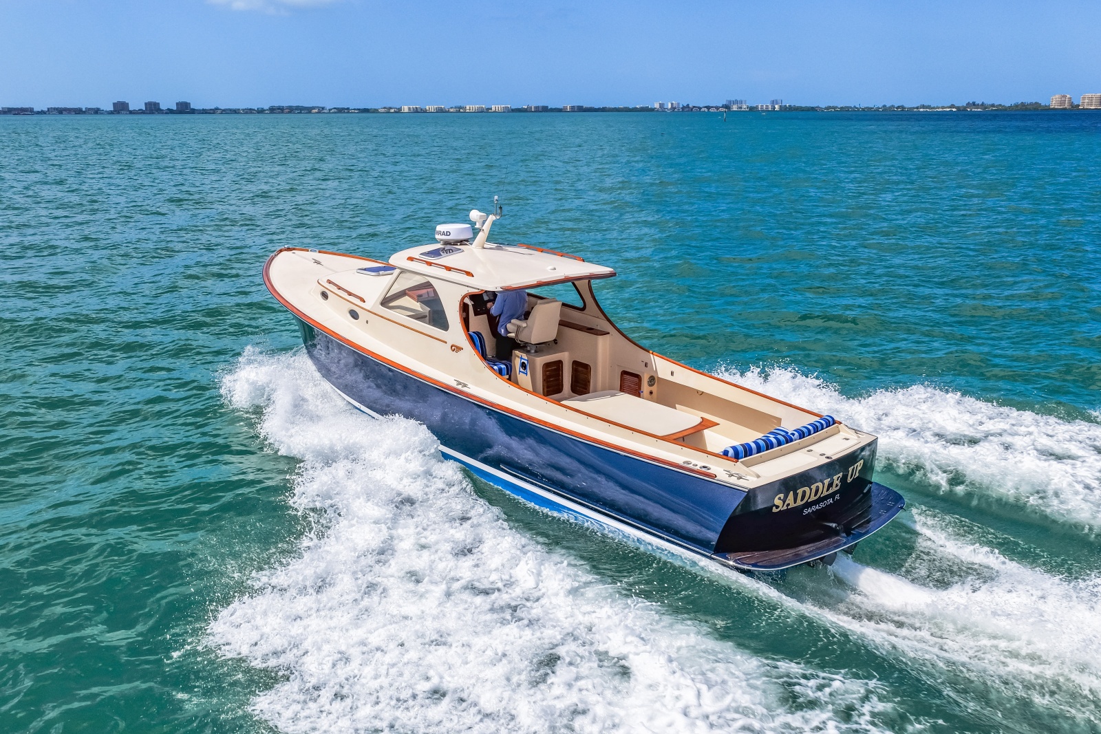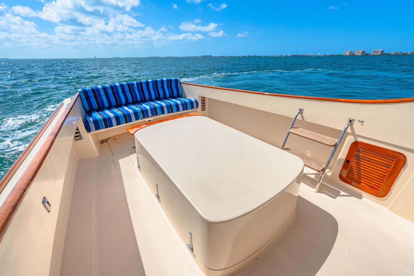 Helm Station has a varnished teak instrument pod, stainless steel 14” steering wheel with varnished wood rim, “Jet Stick®”, engine gauges, and remote spot light. The Sand colored pedestal helm seat is adjustable and there is a stainless steel footrest.