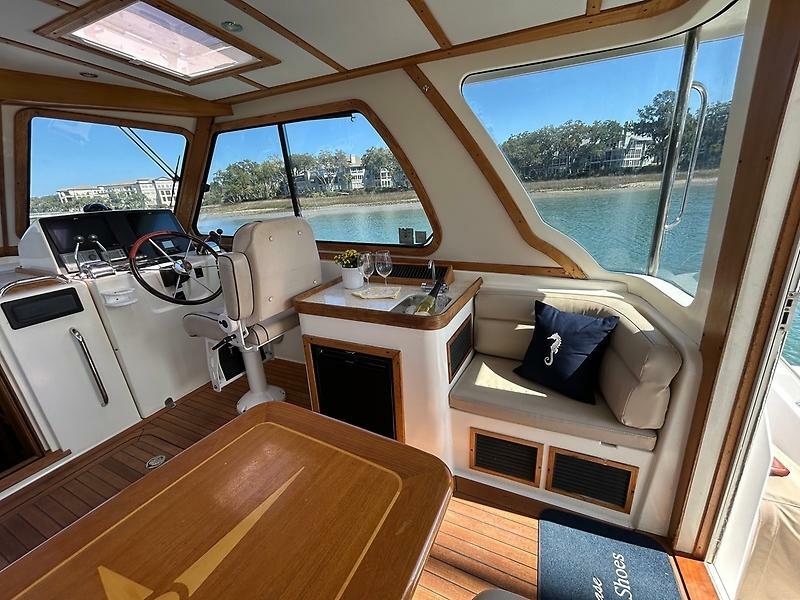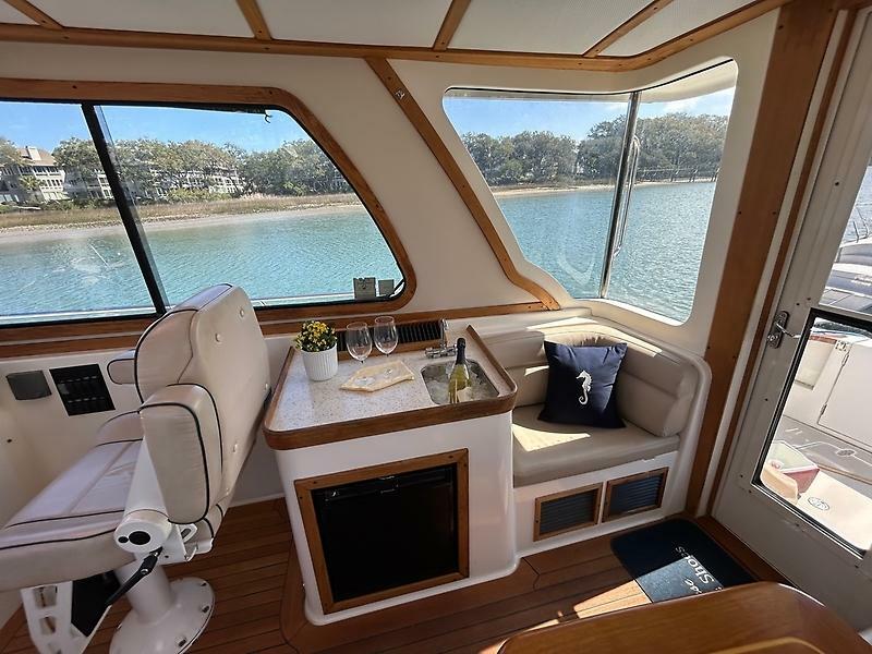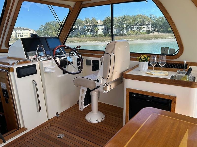 At the dock, she presents the stance of a serious cruiser. The 360-degree air-conditioned views from the helm and salon, paired with generous seating, create an expansive, inviting space that feels larger than anything else in her class.
