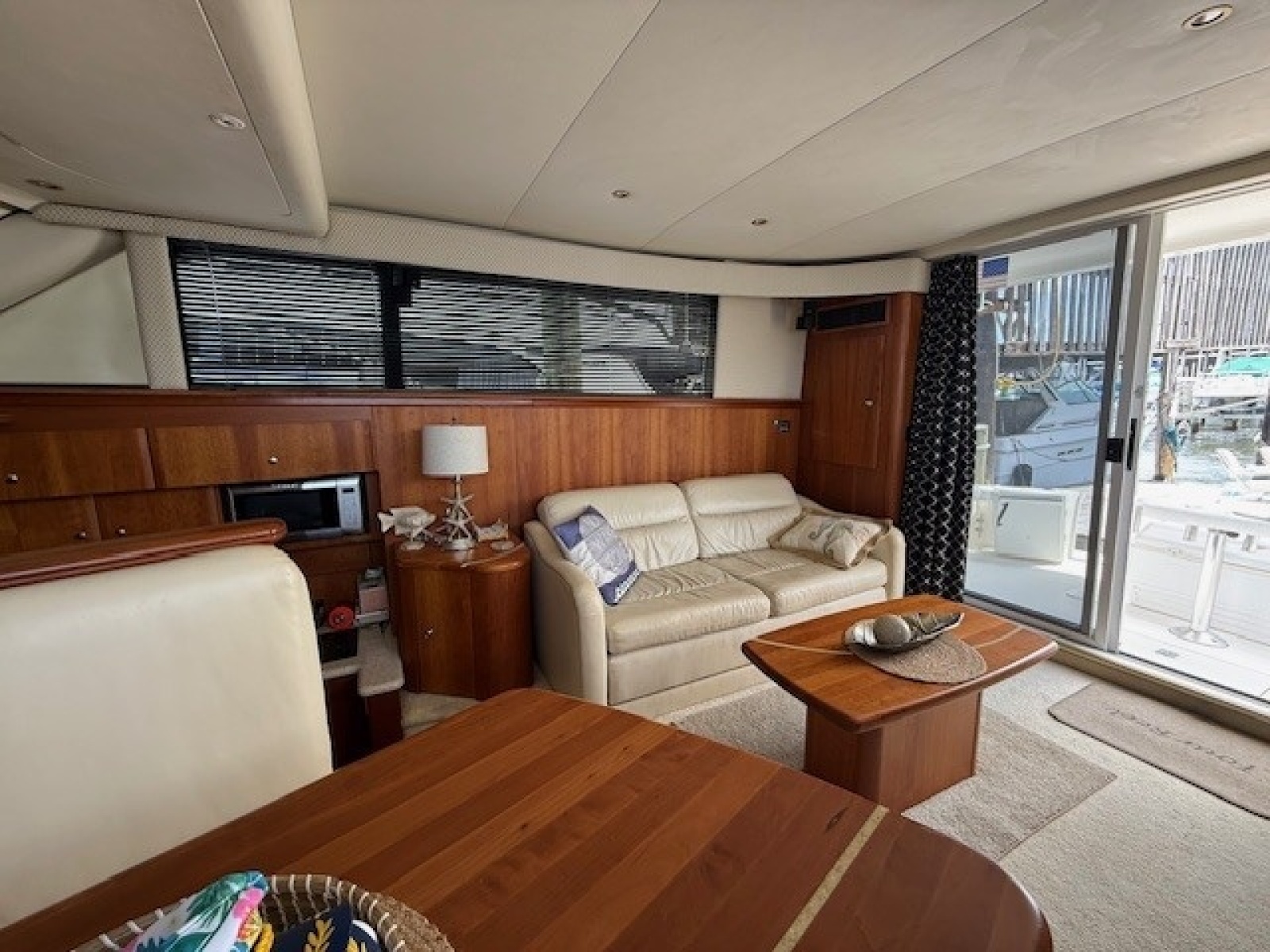 The salon is accessed from the cockpit through large sliding doors. Notable features: