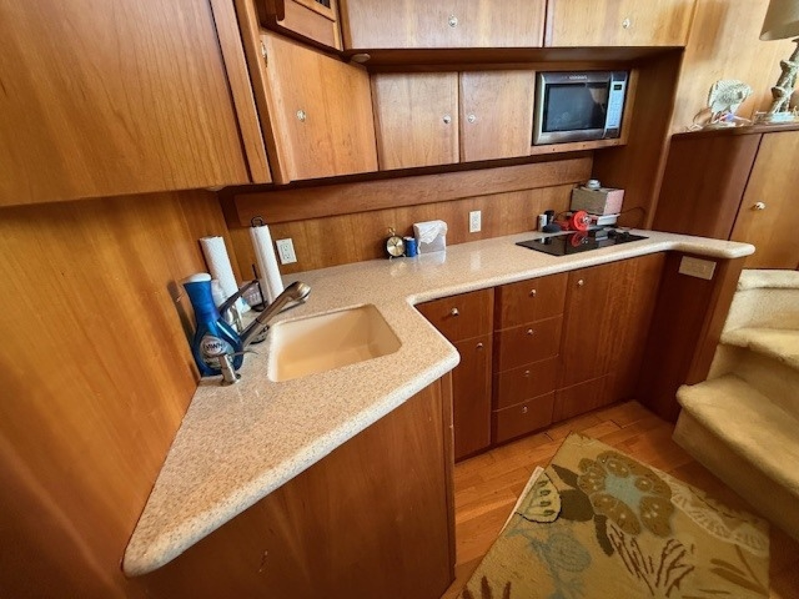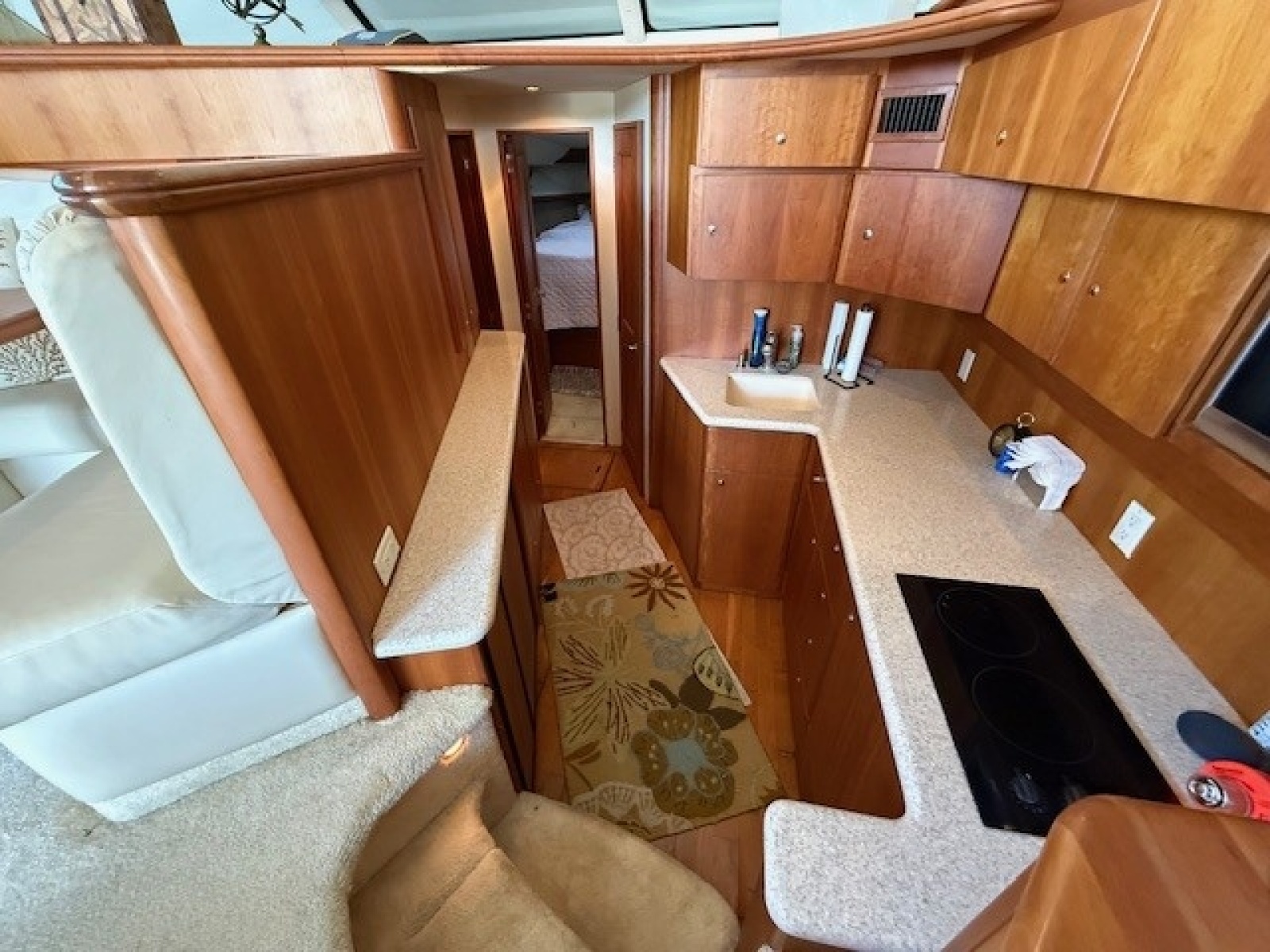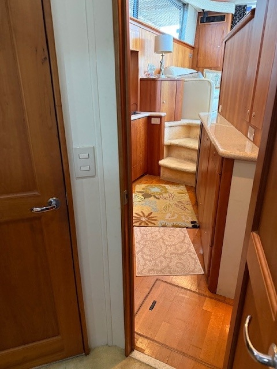 Moving forward on the starboard side and two steps down is the galley. The galley has abundant overhead and under counter storage and the flooring is wood. There is plenty of counter top space along with a sink and cook top. A microwave/convection oven is located in the overhead cabinetry. There is a separate built in ice maker located under the counter on the starboard side and a separate refrigerator and freezer are located under the counter on the port side of the galley.