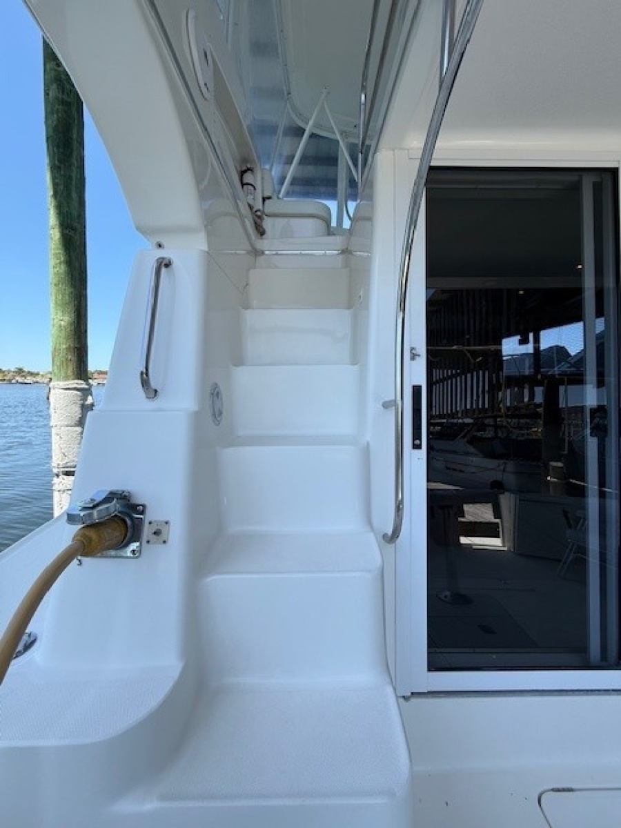 The cockpit is very large for entertaining or fishing activities and has a large transom door located on the starboard side for easy access to the swim platform on the transom. A hot/cold shower is located in the cockpit next to the transom door. There is a removable rocket launcher/rod holder in the center of the cockpit and tackle drawers and sink are located forward on the starboard side of the cockpit. There are rod holders located in the gunnels and overhead on the aft bridge railing. The 50 amp shorepower cord is located on the port side and has an electric Glendenning Cablemaster system. There is a large access hatch in the aft portion of the cockpit that has a lift out storage bin with direct access to the lazarette beneath. Another hatch located forward in the cockpit offers direct access to the engine room and the lazarette. Molded in fiberglass steps port and starboard lead to the wide non-skid sidedecks offering passage forward to the bow.