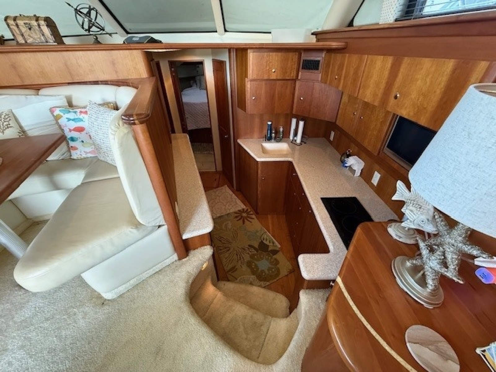 The salon is entered through sliding doors from the cockpit. There are large windows with mini blinds and the forward windshield allows plenty of light in or there is a windshield cover for privacy and heat reduction. Directly to starboard when entering is a sofa that pulls out into a bed. There is a table and a large u-shaped dinette located all the way forward and slightly to port. On the port side upon entering is the entertainment center with TV and stereo with storage cabinet and electric control panel forward of the entertainment center. There is concealed overhead rod storage and the entire salon is carpeted.
