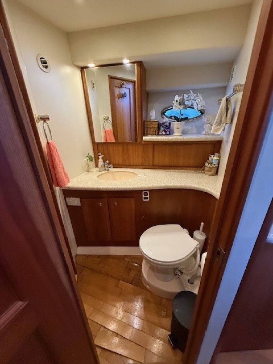 This vessel offers the split head/shower layout. The head portion is located on the starboard side forward of the galley. The shower portion is located on the port side forward of the guest stateroom. The head has access directly from the companionway and the master stateroom. The shower compartment has direct access from the master stateroom and the guest stateroom. Notable features: