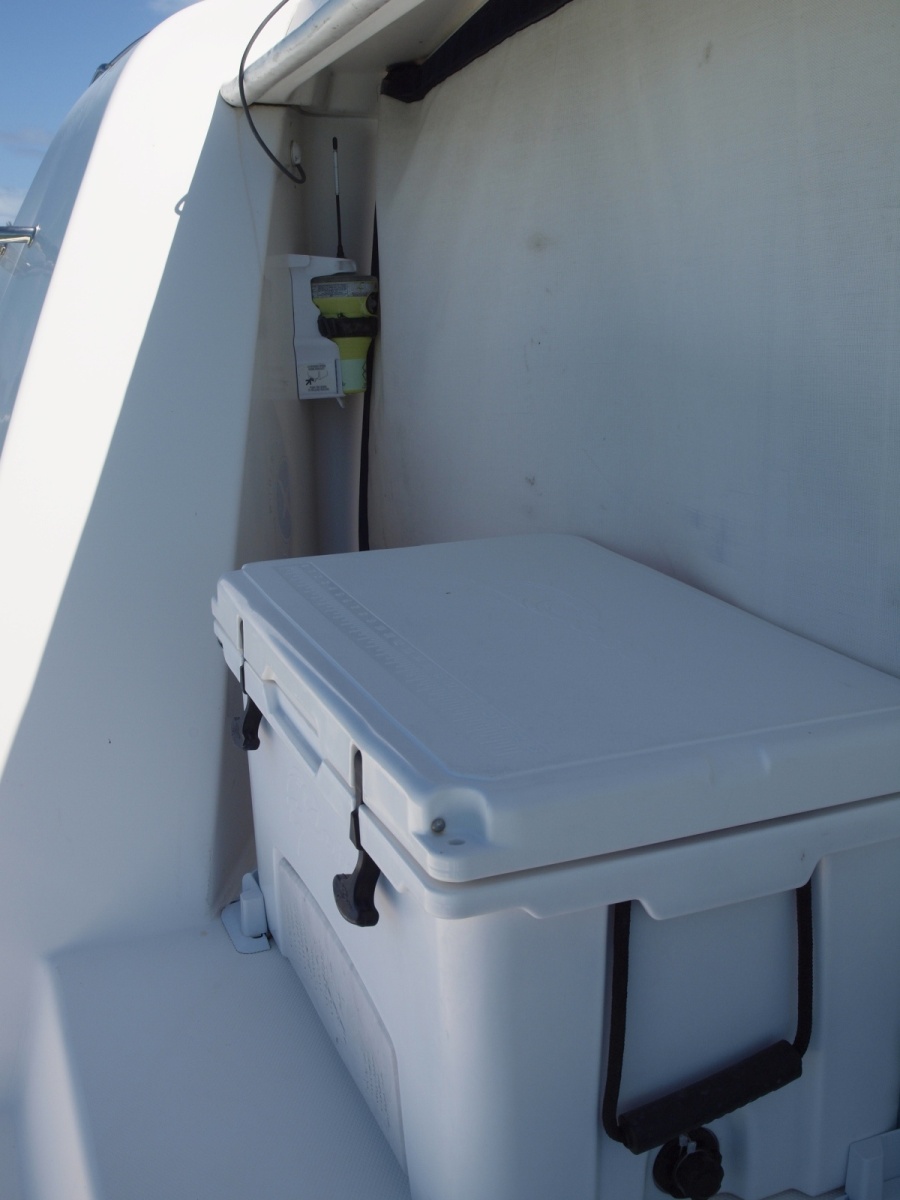 - 3x 5-gallon diesel cans and 1x 5-gallon gasoline can stored in aft dock box to keep fumes out of the vessel