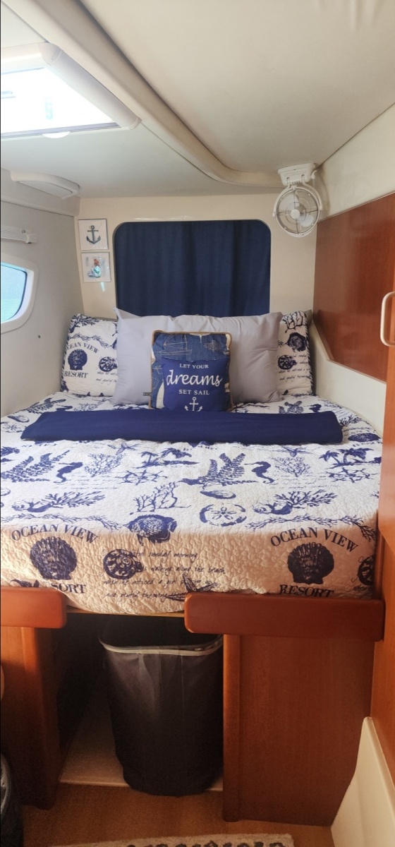 - Forward cabin currently fitted as a workshop/tool garage with 10-drawer custom storage — professionally outfitted but easily returned to guest cabin use