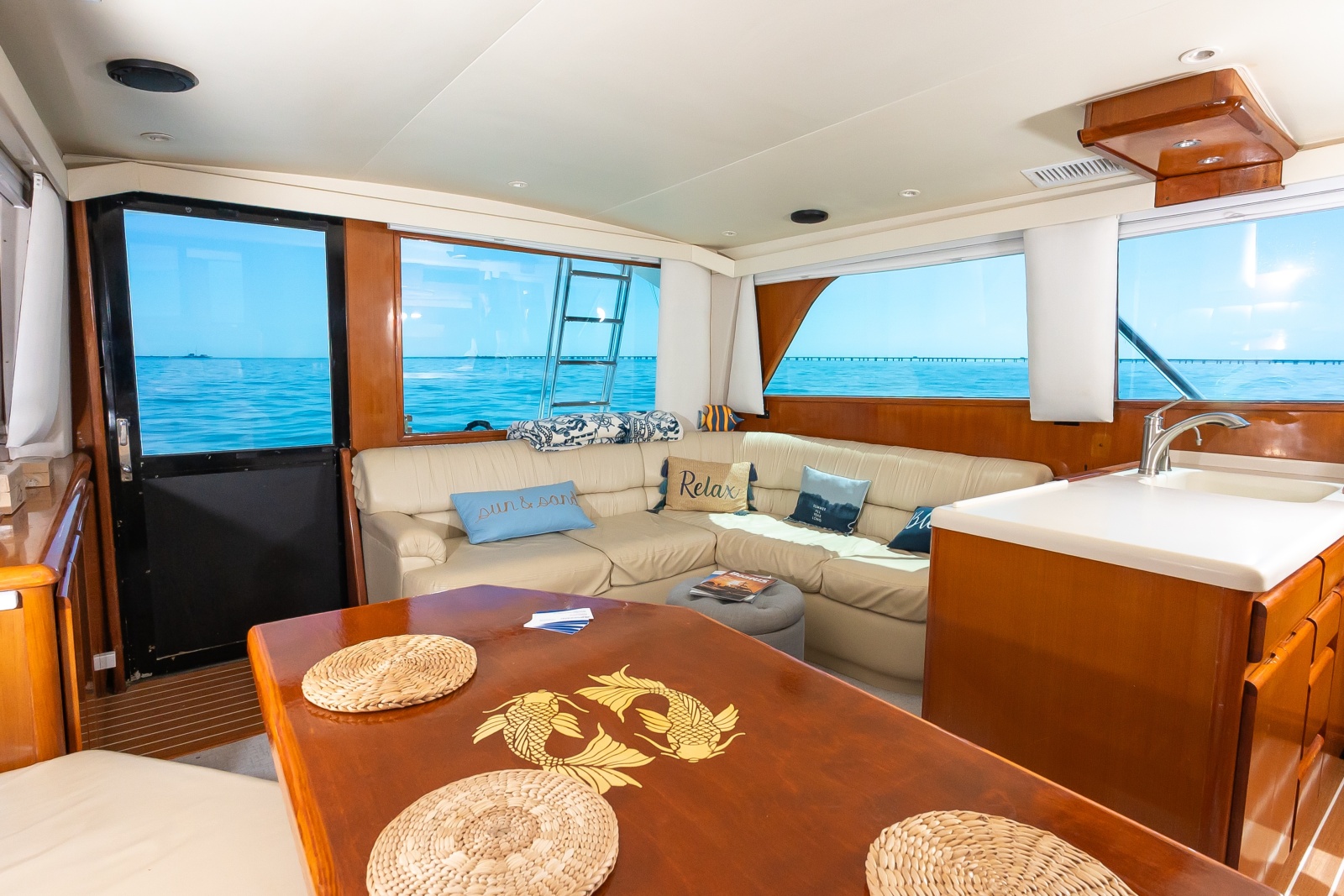 The interior retains Viking’s proven galley-up layout while incorporating tasteful refit-level improvements.