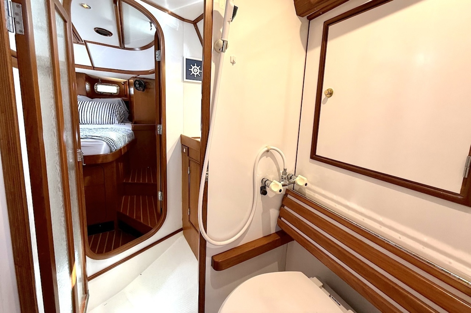 The owner’s en-suite head is arranged for practical offshore use while still offering the comfort expected of a quality cruising yacht. A separate shower stall keeps the space drier and more usable than a typical wet-head arrangement, and the teak joinery and Corian-style surfaces are durable and easy to maintain.