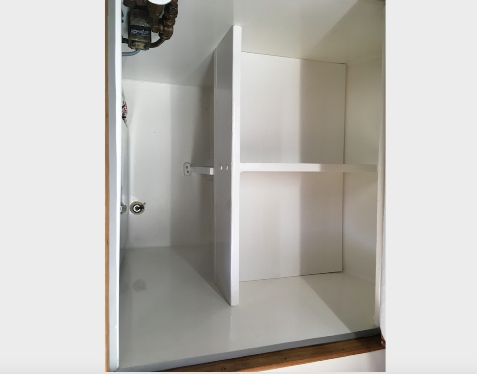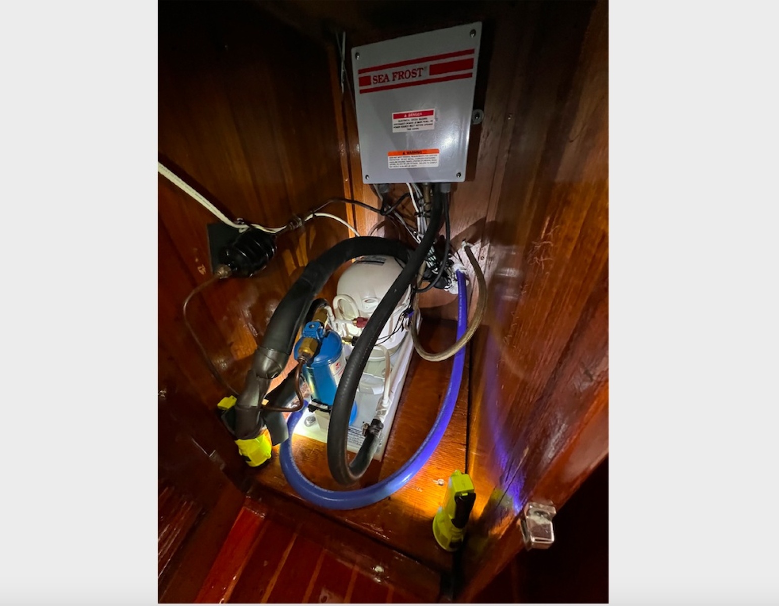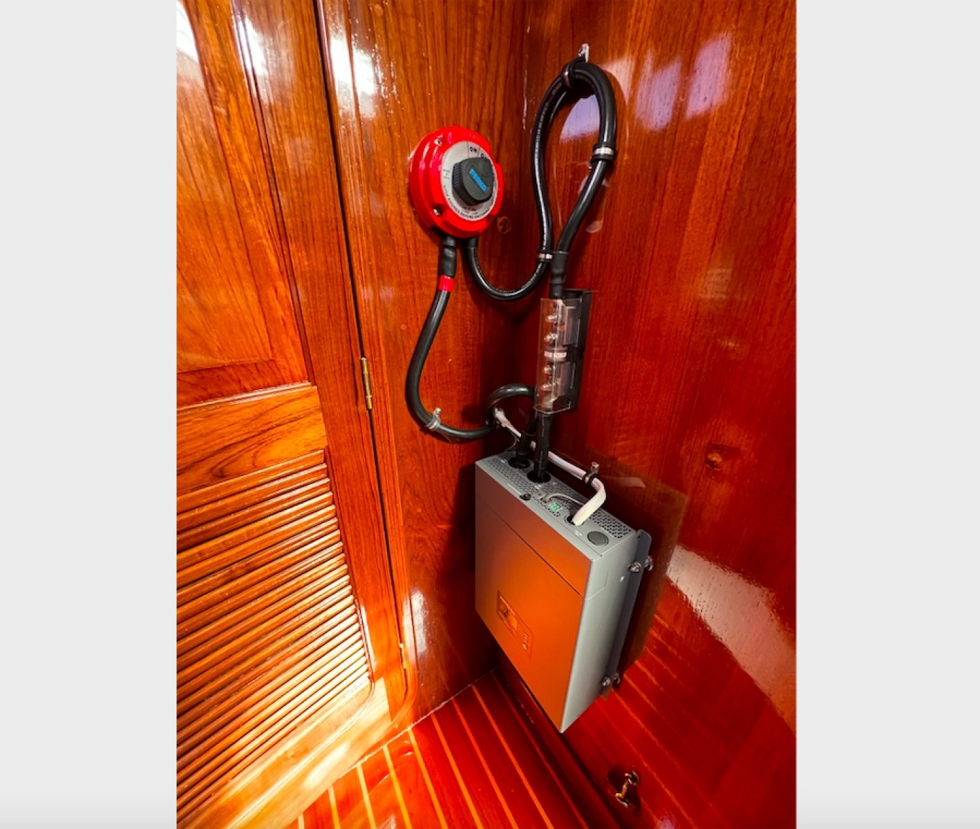 Custom 6 cu/ft refrigerator and 5 cu/ft freezer compartments each with Crosby dual holding plates and Seafrost compressor (new 2023), Force 10 3-burner propane stove (new 2023) with two 2.5 gallon aluminum tanks, GE microwave oven (new 2023), one of a kind-custom teak liquor & storage bar between galley and salon, charcoal filtered drinking water faucet and separate sea water faucet at deep double stainless steel sink, 5 gallon electric water heater (new 2022).