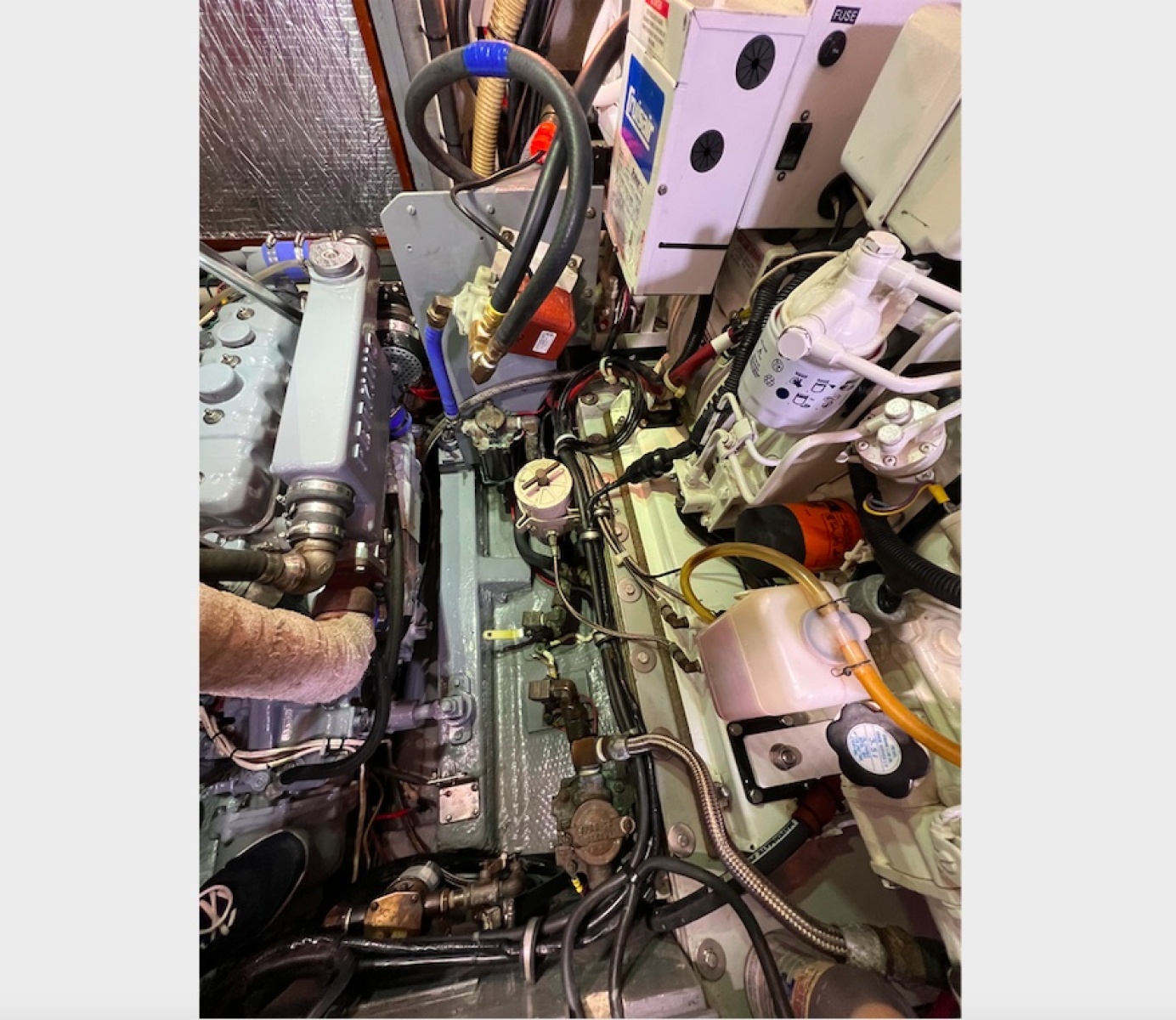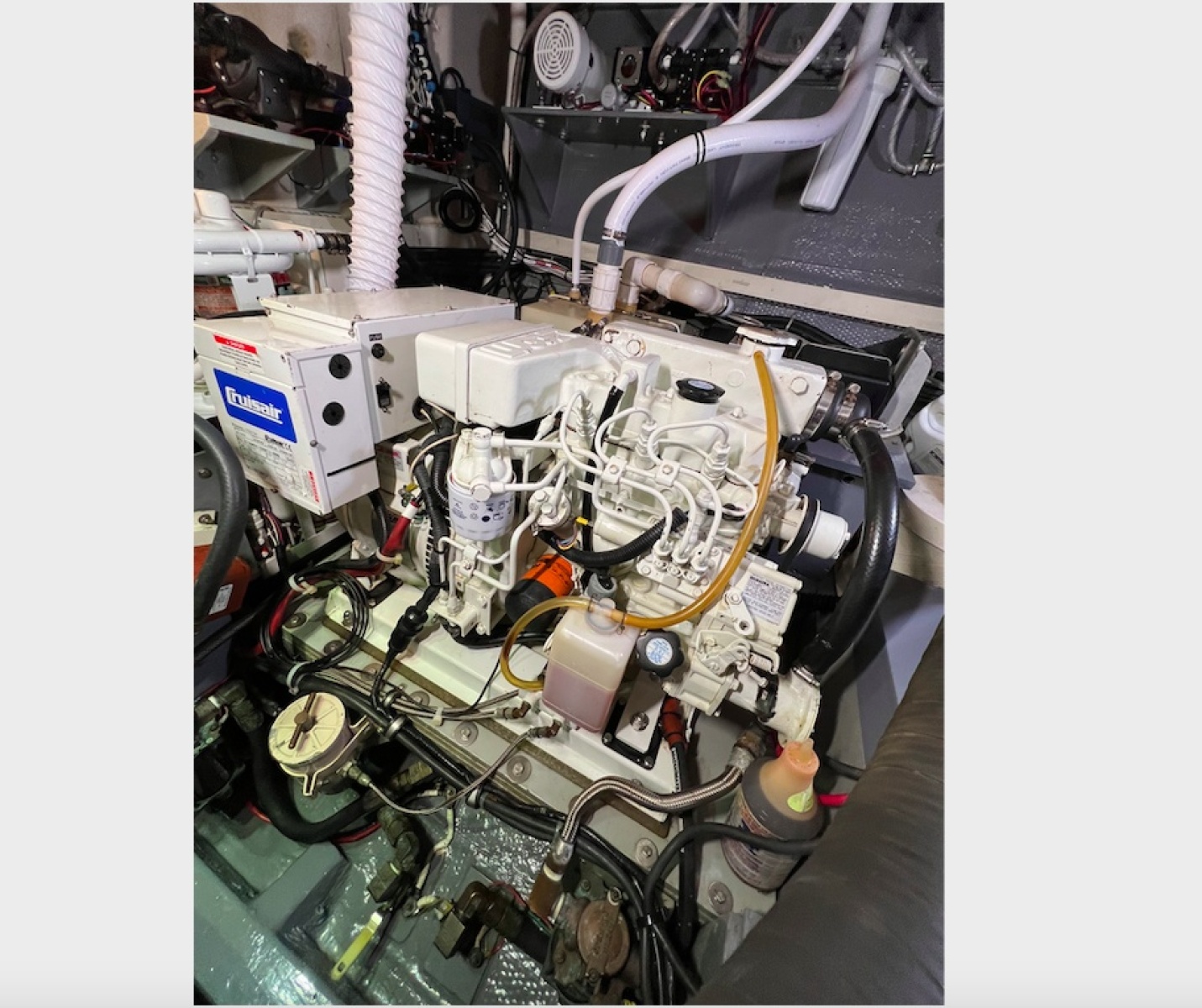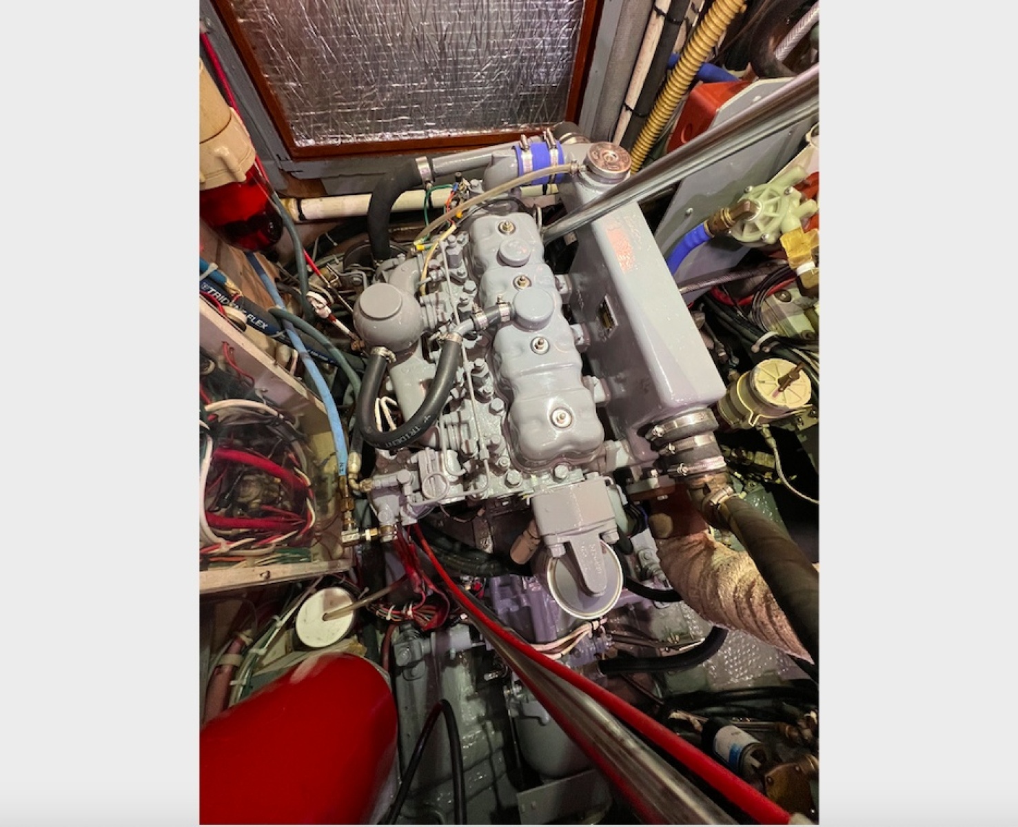 Perkins 4.154-62hp inboard diesel with less than 100 hours since major overhaul, 900 Racor fuel filter, Borg Warner marine transmission, Northern Lights 8.5-KW diesel generator with 2950 hours, 500 Racor fuel filter, mechanical steering wheel with hydraulic steering by auto pilot, 16,000BTU reverse cycle Marine Aire A/C system split to both staterooms (new 2023), 12,000BTU reverse cycle A/C for salon, Ecotec 12 volt 336 gallon per day water maker (new 2020), Crown Raritan 12v toilet in master head (new 2025), Maxi-Prop propeller (new 2022), Xantrex 2000 watt inverter (new 2020), Newmar 12 volt 80 amp battery charger, three 175-watt solar panels mounted on davits with tilting base and solar battery charger (new 2020), four bank battery system with all West Marine gel cel batteries, Niehoff 60 amp brushless alternator (new 2023). All battery banks and charging systems are diode isolated. Engine room discharge hoses have JIC screw-on fittings (no hose clamps), multiple shore power cords and accessories, line cutting spurs on shaft, electric pump oil change system. 80 CF scuba tank with 30' diving hose & regulator; both new and never used. Delphi also has an electric pump and 30' of hose to transfer fuel from tanks on deck to the fuel fill port. There's a 12 volt outlet on deck to plug in the fuel transfer pump.