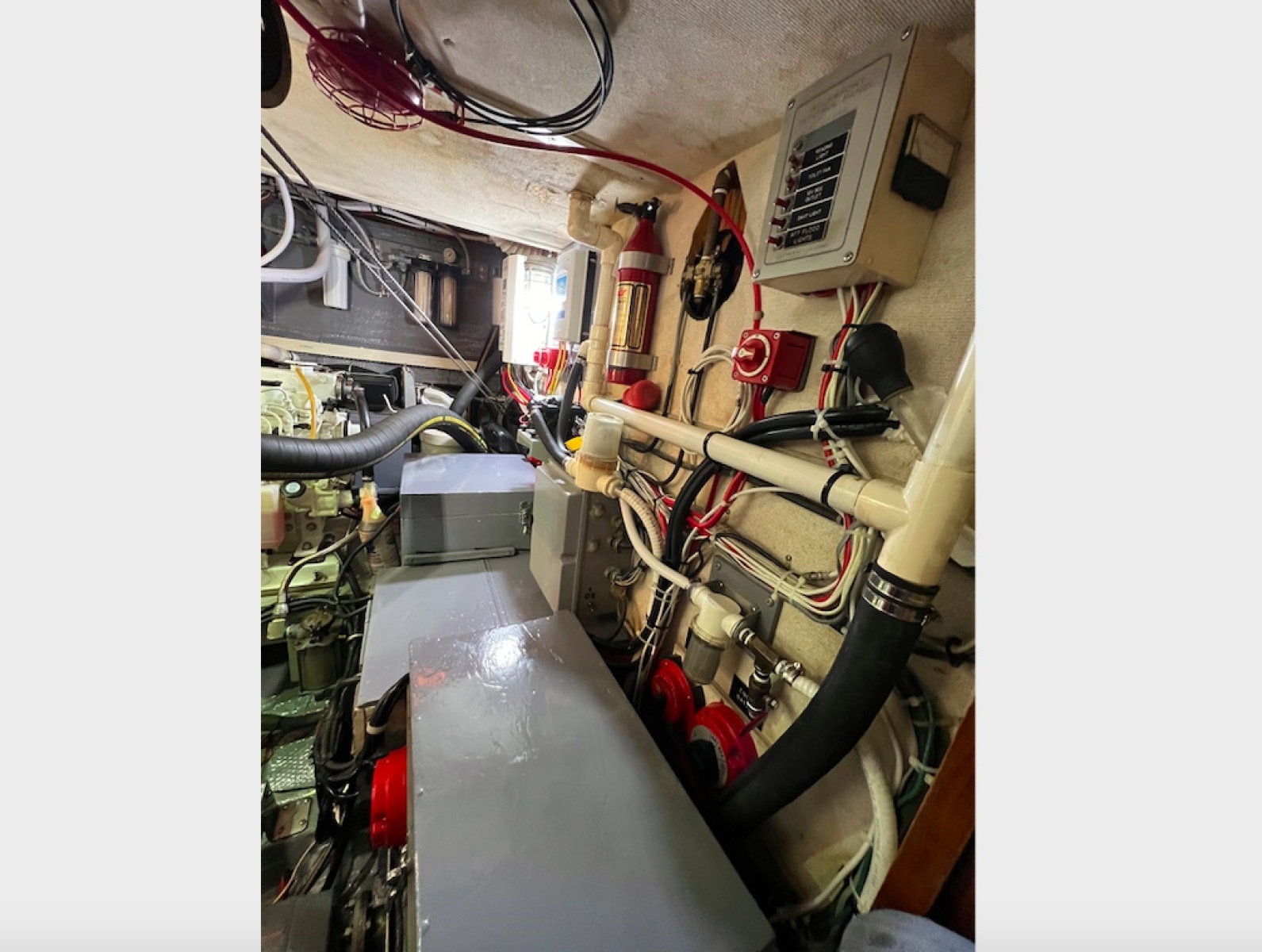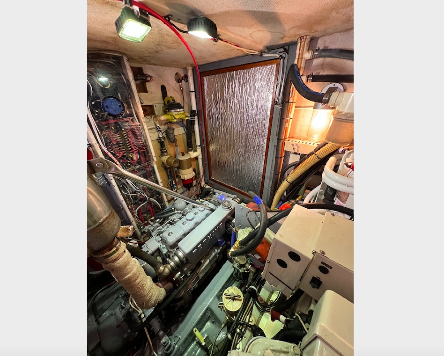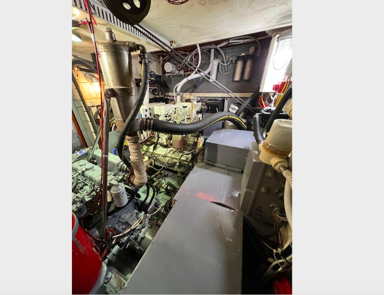 Perkins 4.154-62hp inboard diesel with less than 100 hours since major overhaul, 900 Racor fuel filter, Borg Warner marine transmission, Northern Lights 8.5-KW diesel generator with 2950 hours, 500 Racor fuel filter, mechanical steering wheel with hydraulic steering by auto pilot, 16,000BTU reverse cycle Marine Aire A/C system split to both staterooms (new 2023), 12,000BTU reverse cycle A/C for salon, Ecotec 12 volt 336 gallon per day water maker (new 2020), Crown Raritan 12v toilet in master head (new 2025), Maxi-Prop propeller (new 2022), Xantrex 2000 watt inverter (new 2020), Newmar 12 volt 80 amp battery charger, three 175-watt solar panels mounted on davits with tilting base and solar battery charger (new 2020), four bank battery system with all West Marine gel cel batteries, Niehoff 60 amp brushless alternator (new 2023). All battery banks and charging systems are diode isolated. Engine room discharge hoses have JIC screw-on fittings (no hose clamps), multiple shore power cords and accessories, line cutting spurs on shaft, electric pump oil change system. 80 CF scuba tank with 30' diving hose & regulator; both new and never used. Delphi also has an electric pump and 30' of hose to transfer fuel from tanks on deck to the fuel fill port. There's a 12 volt outlet on deck to plug in the fuel transfer pump.