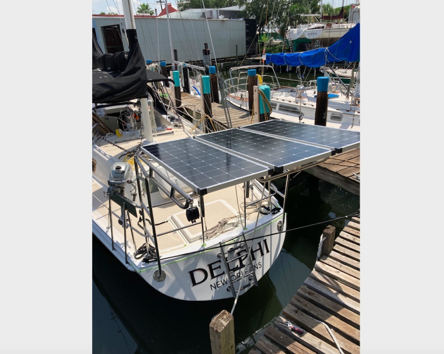 On a bright day, the three 175-watt solar panels produce sufficient power to operate the autopilot, GPS, and refrigerator/freezer. During extended passages, running the generator for 2–3 hours in the evening maintains all systems and provides hot water.