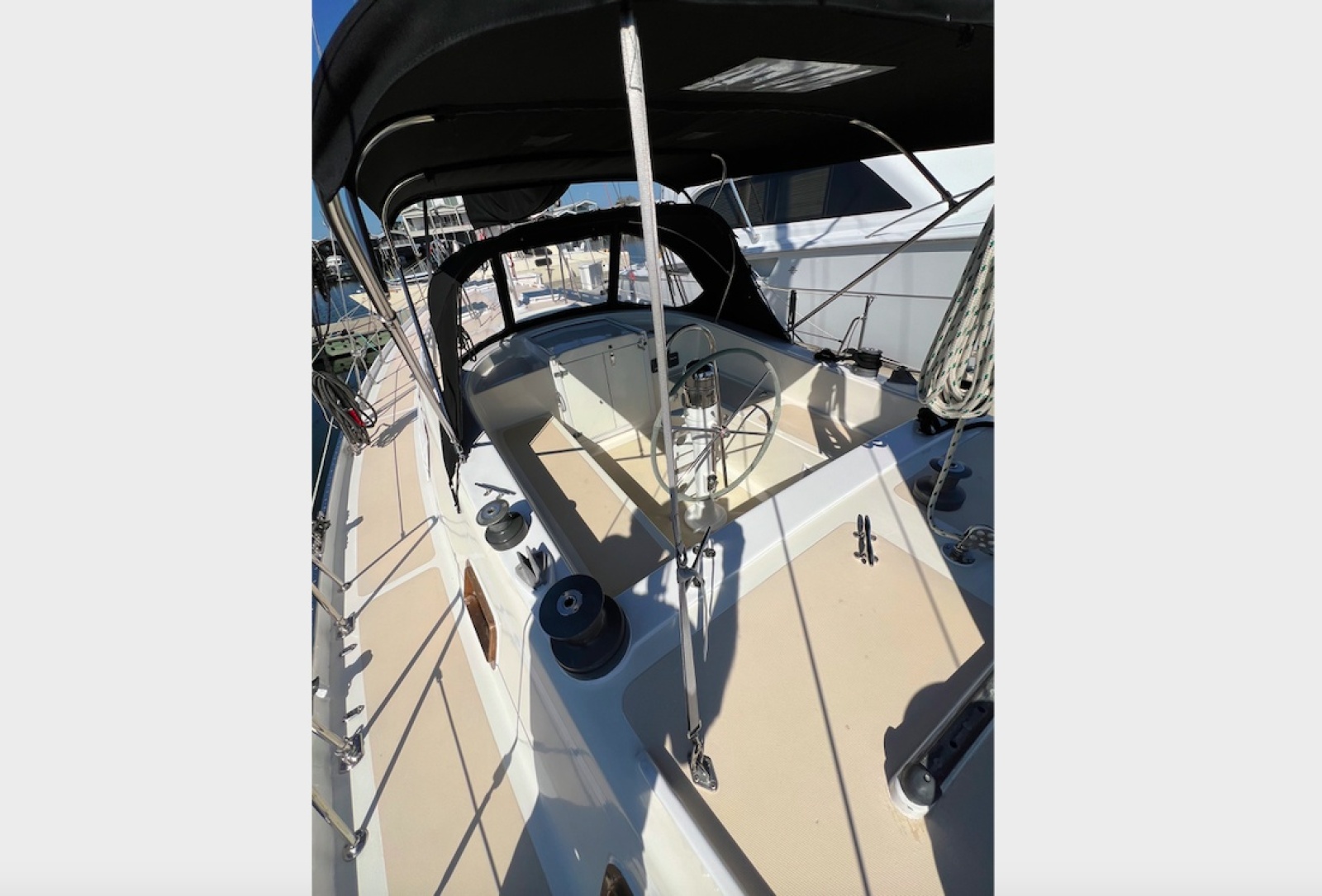 Fiberglass non-skid decks, stainless rail stanchions with cable life lines, custom stainless steel manual davits for dinghy (new 2020), custom stainless steel swim boarding ladder on transom, custom (removable) stainless steel portable boarding ladder on port side, Ideal 12 volt anchor windlass (factory reconditioned 2020) with foot pedal control and remote cockpit control, one 45lb plow anchor with 150’ of chain (new 2020) and 150’ of rode, spare 40lb Danforth anchor with 150’ of rode, spare 40lb Danforth anchor, Achilles inflatable tender with 15hp 2-stroke Yamaha outboard (new 2023) and 2hp Honda outboard, black Sunbrella dodger top (new 2025) with stainless steel frames, black Sunbrella cockpit bimini with stainless frames, Viking 8-man life raft with ACR PLB EPIRB packed inside.