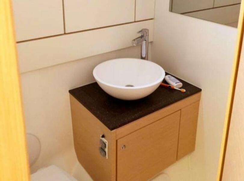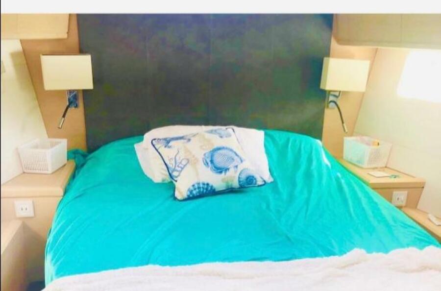 The Owner's Suite is located forward with a centreline queen, ensuite head with shower, and oversized ports above the bed. Aft to Port is the ViP Cabin with a queen berth, ensuite head and shower, and generous headroom. Aft to Starboard is the 3rd cabin with 2 twin berths and the day head just forward.