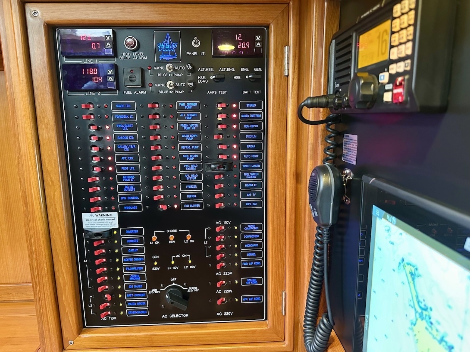 The plumbing and tankage systems aboard RELENTLESS reflect the priorities of a serious passagemaking yacht: generous capacity, quality materials, and the flexibility needed for extended time aboard. With three stainless steel freshwater tanks, five stainless steel fuel tanks, and two fiberglass holding tanks of 27 gallons each, she offers the kind of range and autonomy that experienced cruisers value. Tank monitoring is integrated at the nav station, allowing for straightforward systems oversight underway or at anchor.
