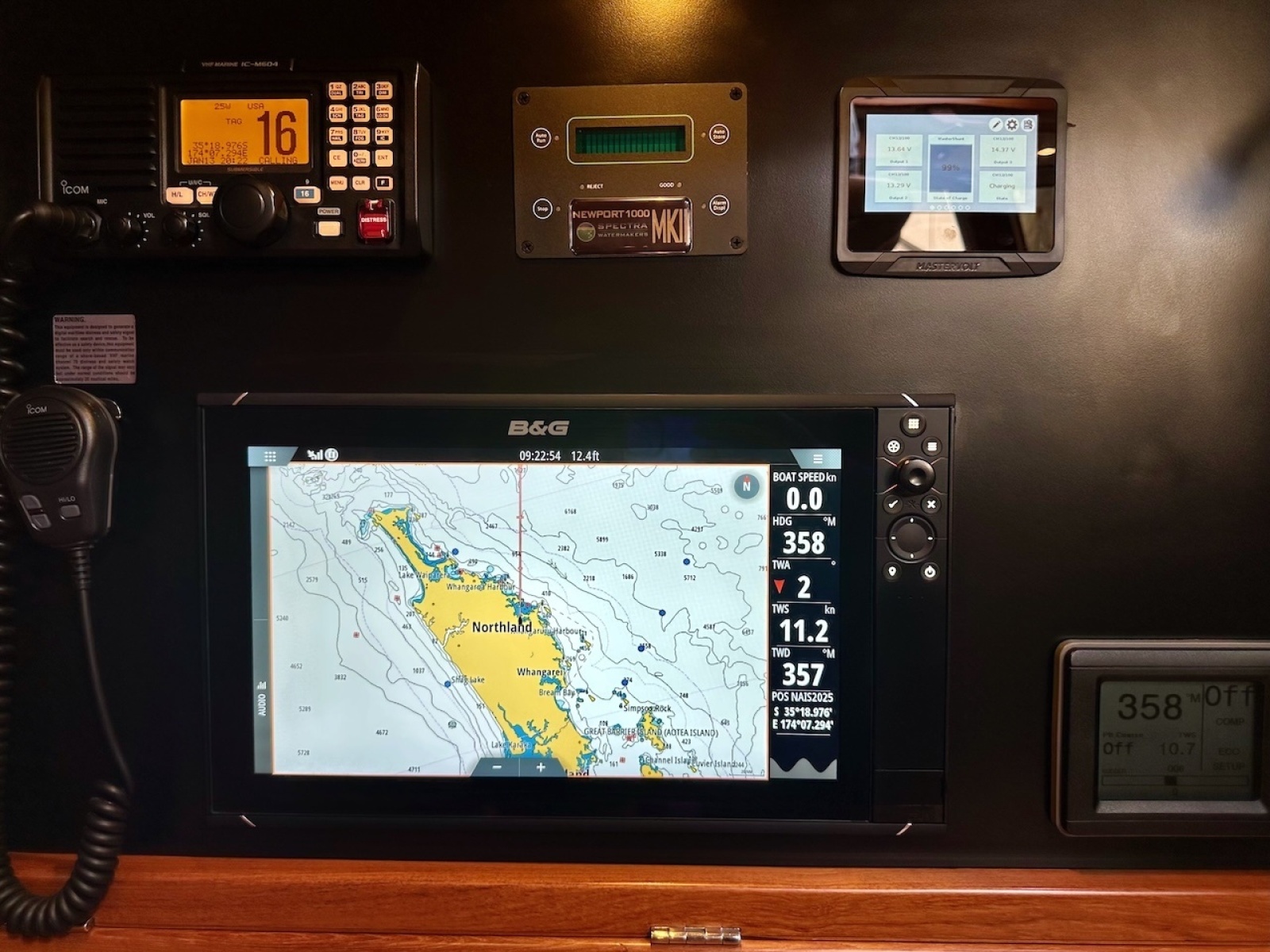 Mechanically and electrically, RELENTLESS is outfitted as a serious long-range cruiser. Her 150 HP Yanmar, Northern Lights 9kW generator, Mastervolt inverter/charger system, extensive AGM battery capacity, 782W of Solbian solar, Spectra watermaker, reverse-cycle air conditioning, bow thruster, and excellent fuel and tank management systems all support comfortable, independent cruising. The electronics suite is also first-rate, with premium B&G H3000 instrumentation, Zeus 3S displays from 2022, HALO24 radar, Starlink, Iridium Go, AIS, upgraded security and tracking, and a very well-developed onboard communications network. She is not simply equipped to cruise—she is equipped to cruise well, with the kind of redundancy, integration, and owner usability that experienced buyers immediately recognize.