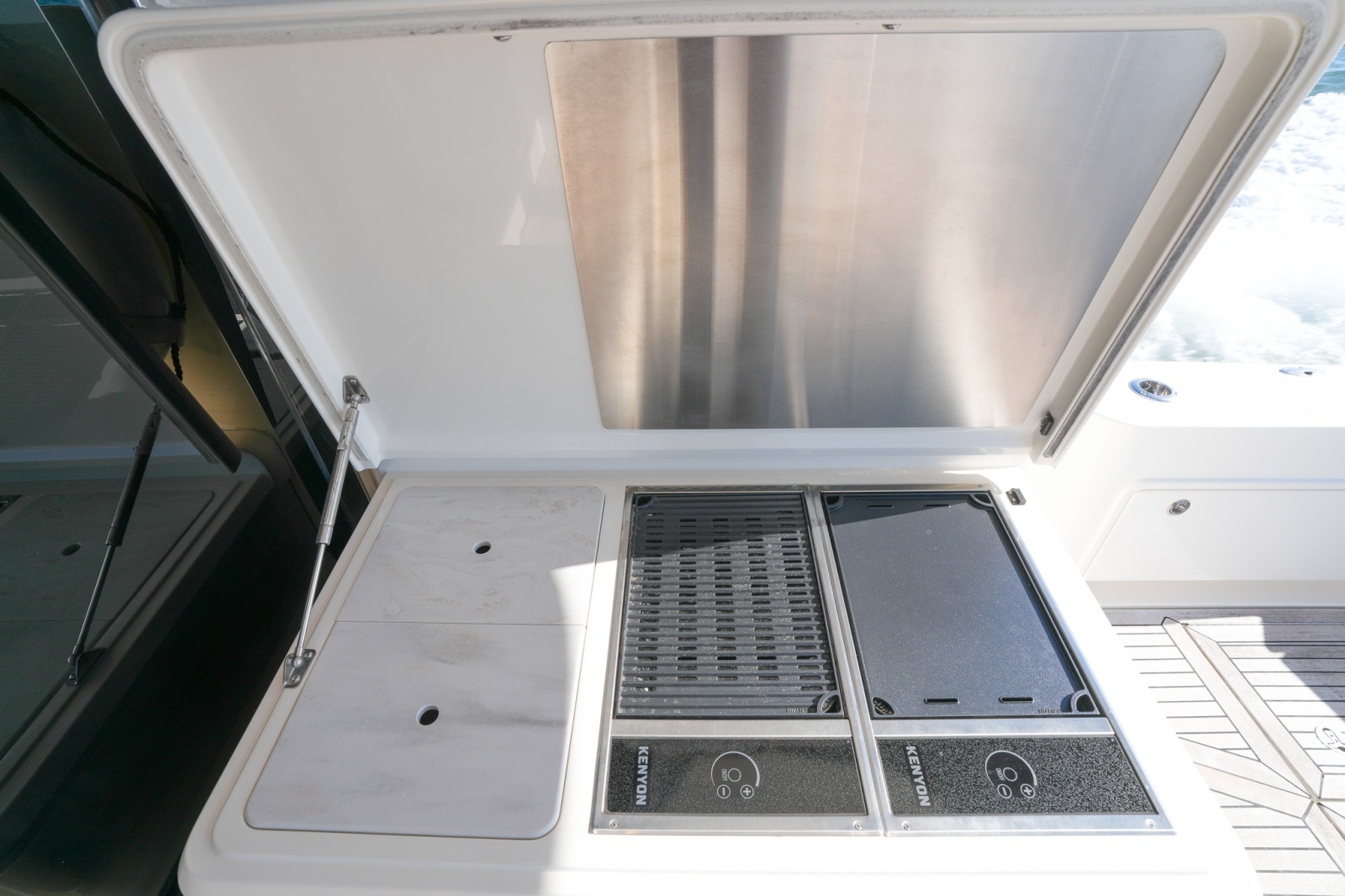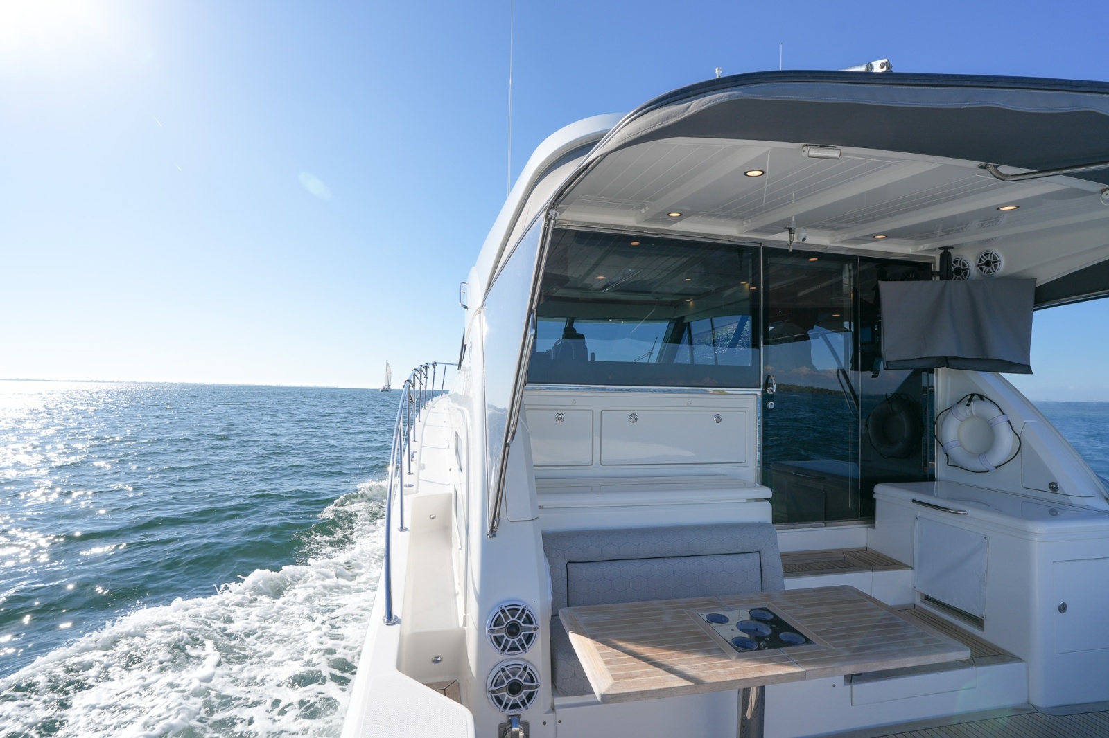 Forward in the cockpit, a large deep freezer is perfectly positioned forward of an aft-facing settee with a folding table with cupholders, creating a comfortable, shaded space ideal for alfresco dining or relaxing after a day on the water. To starboard, an outdoor galley features a grill and sink, complemented by an overhead TV, making this area a natural gathering space for entertaining guests in style.