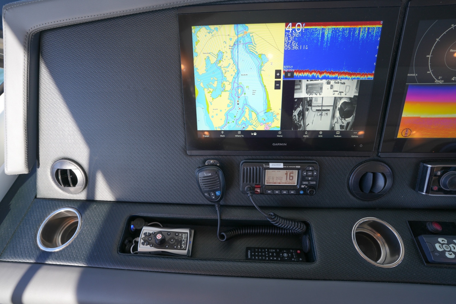 - Garmin navigation suite with plotter, radar, AIS, autopilot, depth, and sonar