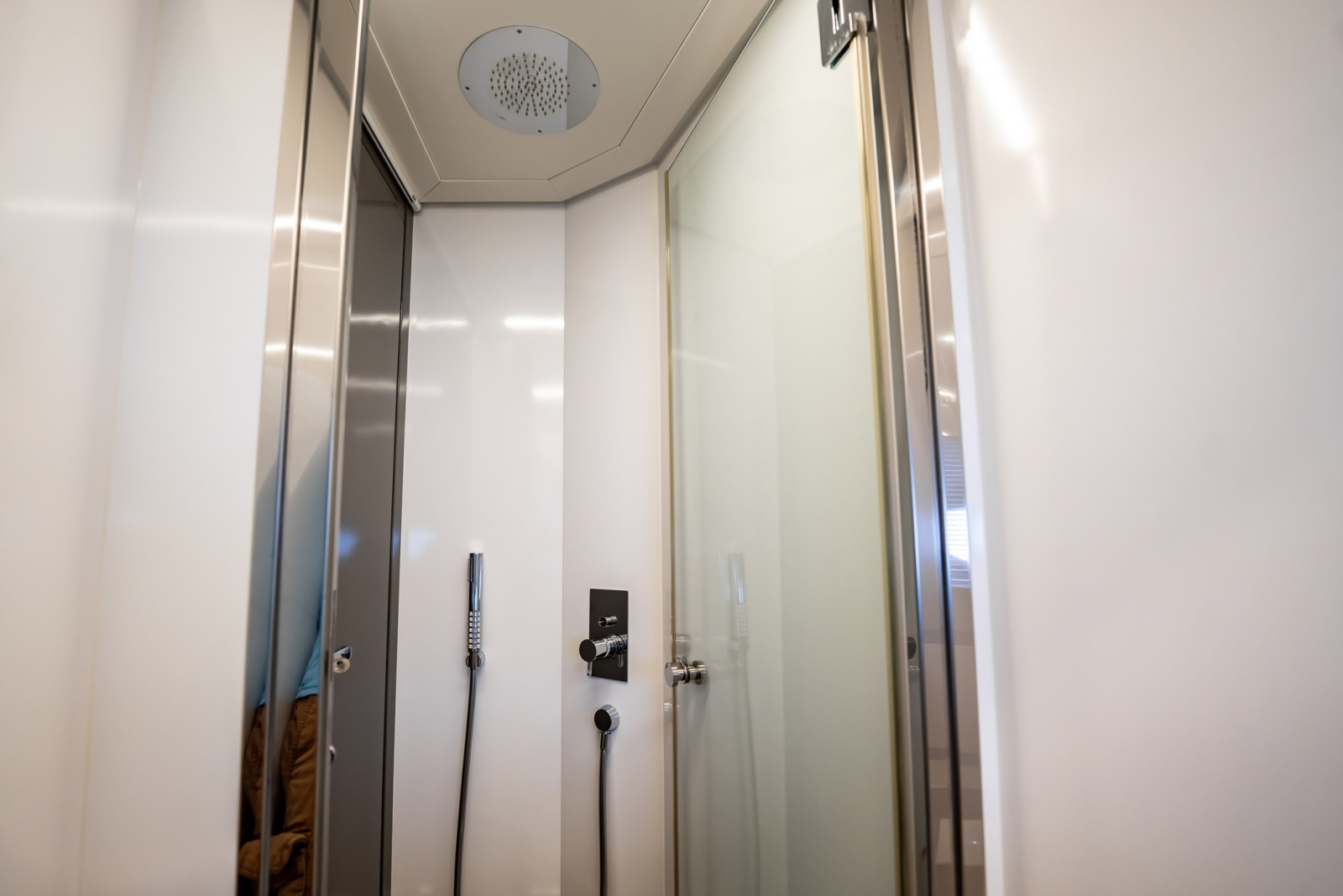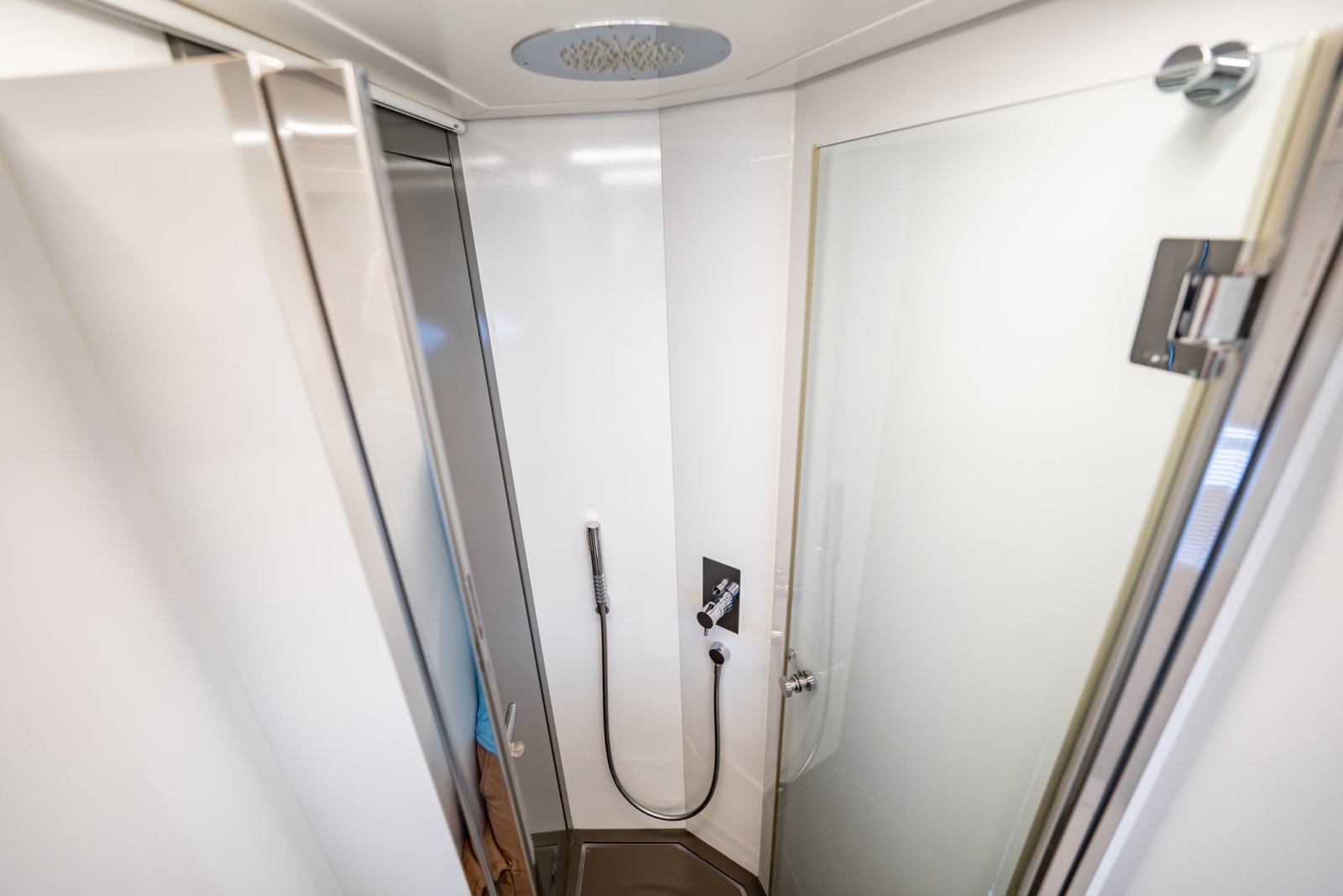 The brand-new Pershing 62 immediately captures attention with its sleek, slender profile. The hull and superstructure have been designed to create a slim, fast yacht with aggressive lines and a sporty personality, accentuated by the unique shape of the hull windows. These windows are a distinctive feature of Pershing’s new era. They are present in this model, maintaining a cohesive family design while ensuring ample natural light in the full-beam master cabin located amidships. The VIP cabin also features two porthole windows, providing plenty of natural light. The Pershing 62 is available in two configurations: one with three cabins and three heads, each with a separate shower, and another with two cabins—the master stateroom and the VIP cabin—where a living area replaces the guest cabin.