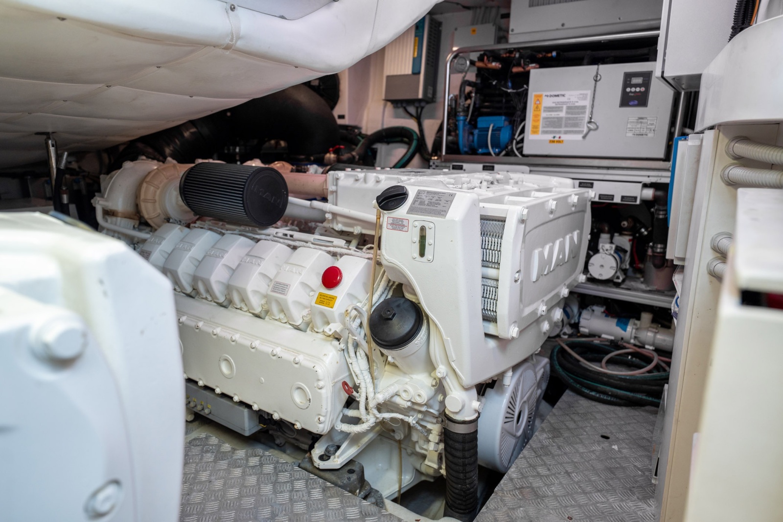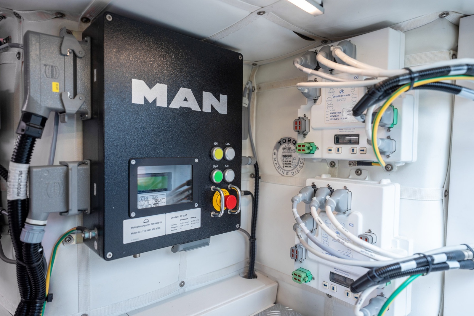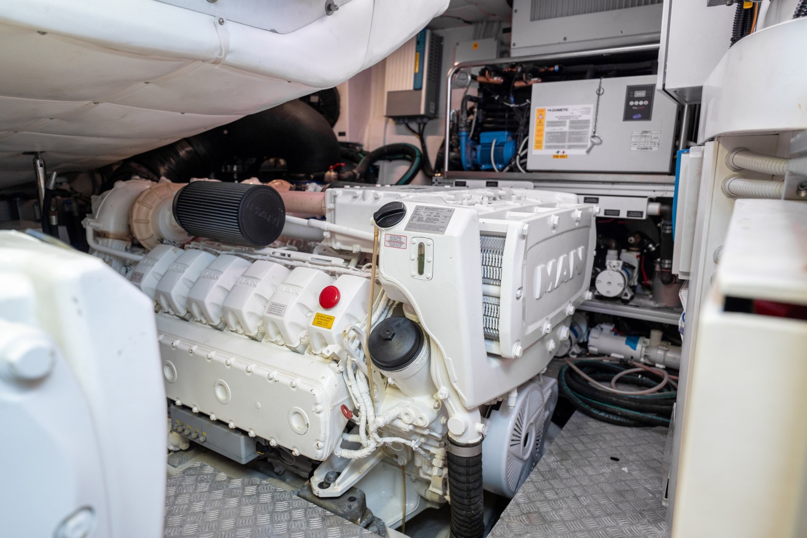 With an overall length of 65.67 feet, this vessel is designed for both comfort and speed. Powered by twin MAN D2862LE426 engines, each delivering an impressive 1550 horsepower, it achieves a cruising speed of 42 knots and a maximum hull speed of 46 knots, ensuring exhilarating adventures on the water.