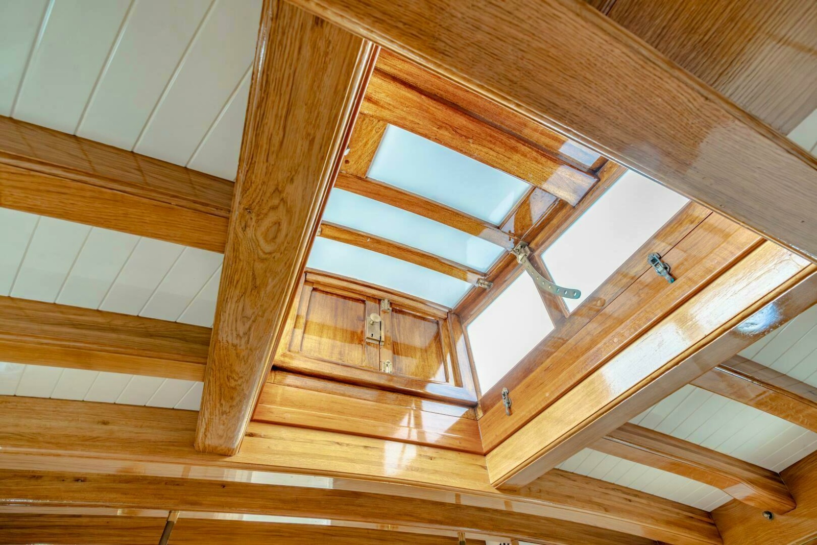 After the passerelle, on deck, you first have the doghouse which is the main cockpit opposite the steering wheel, where you can find the new Garmin navigation equipment. Then the skylights and the mahogany cabinetry.