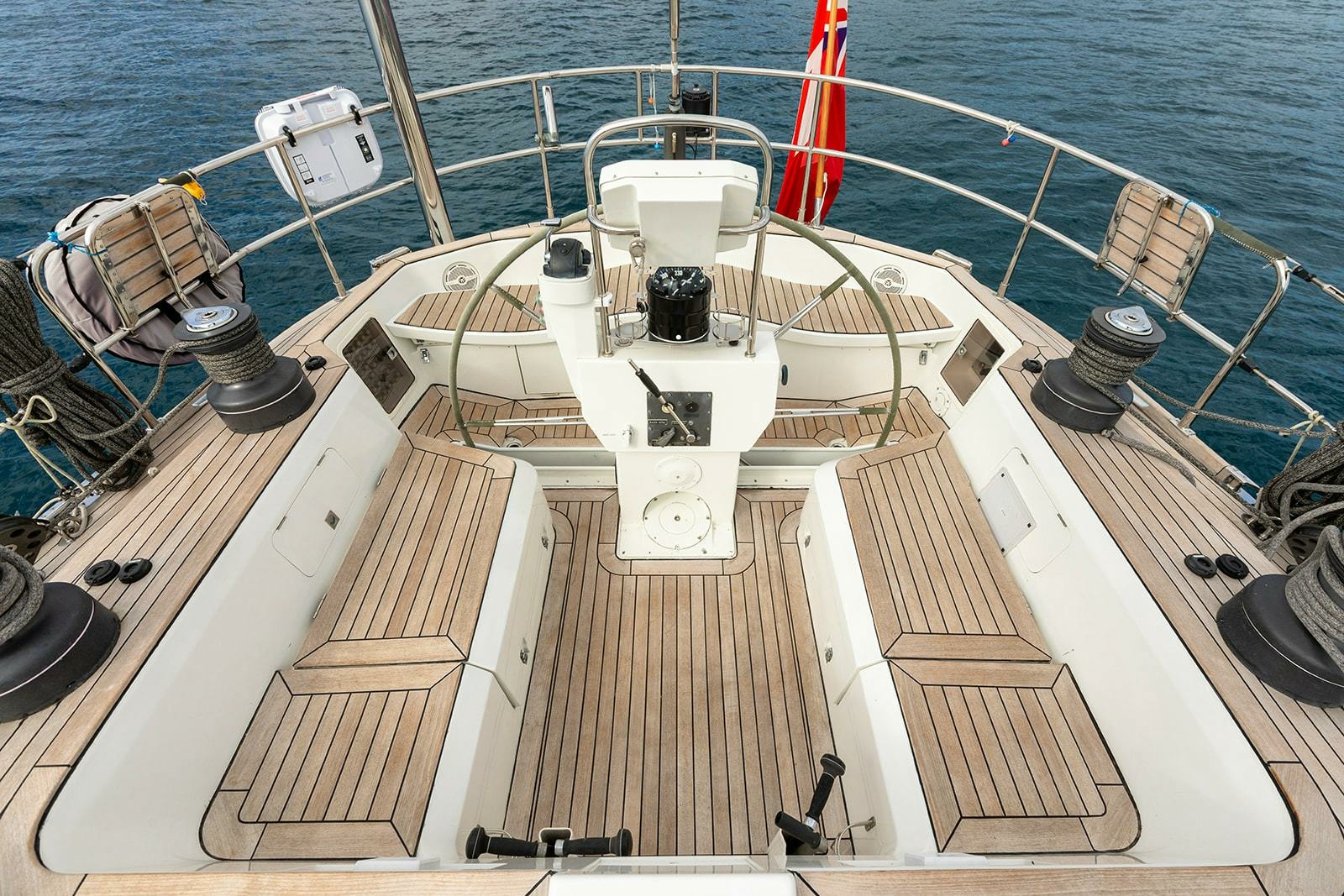 Aft cockpit cushions Wheel Cockpit: Instrument dashbord with plotter/radar display, autopilot control, bow thruster control, electronic engine trottle, engine display, hydraulic fore furlers controls
