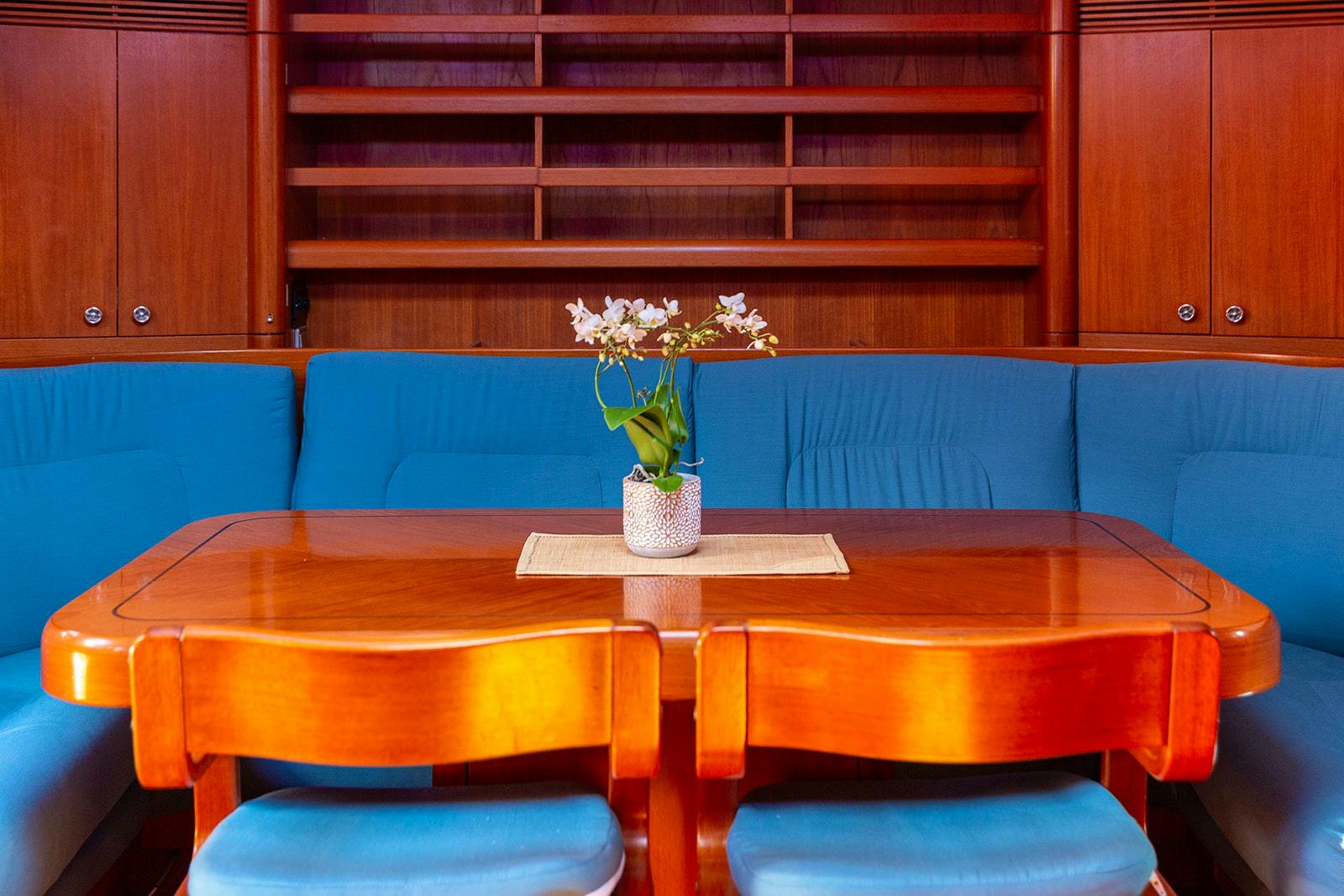 Owner:- Master cabin aft with two queen doubles. Forward facing sofa. Owners study with classic Nautor Swan chair and desk. Lots of natural light through three portholes. Two hanging wardrobes and lots of additional storage in drawers under beds and head height cupboards.