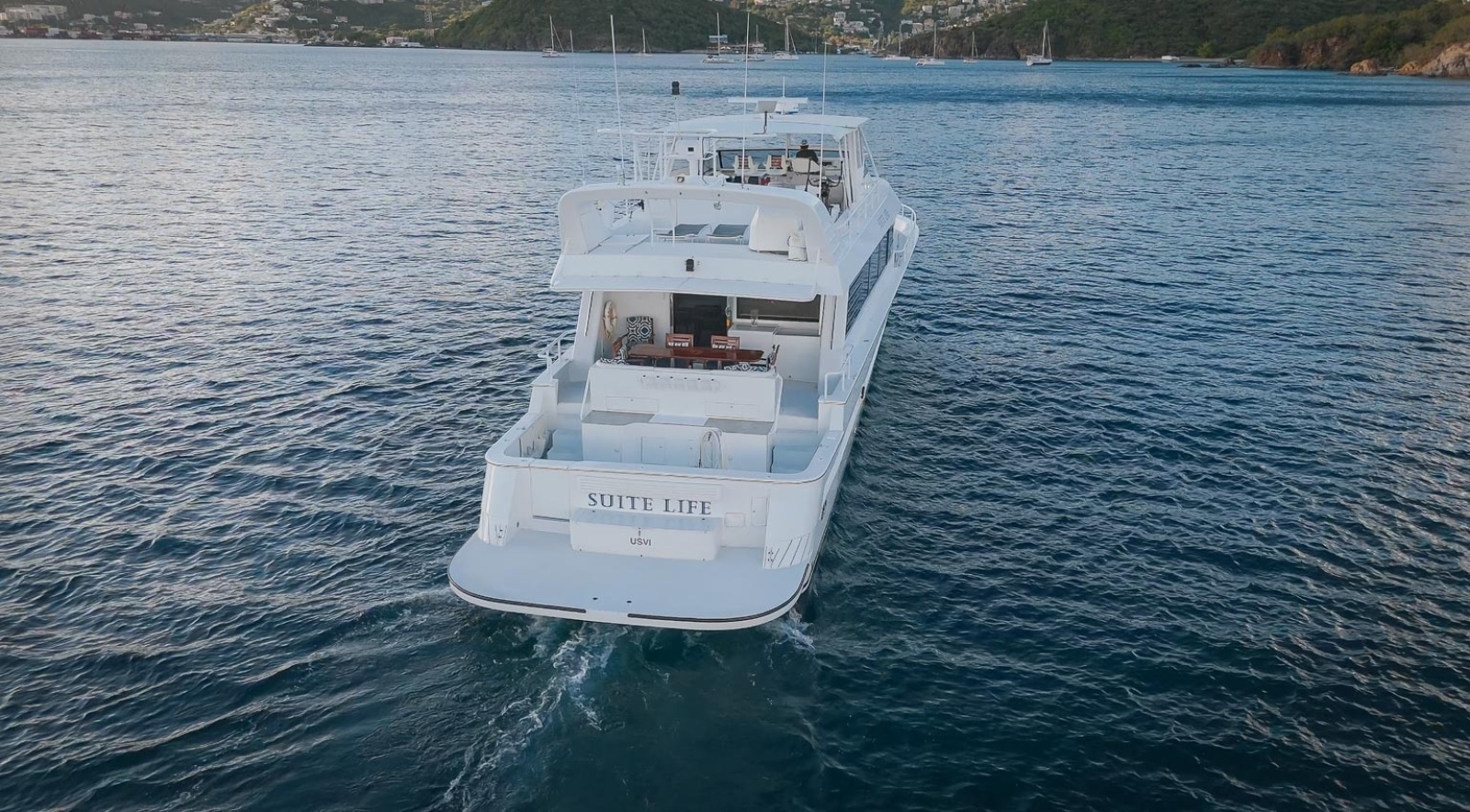 Underway, Suite Life delivers a smooth and capable ride powered by twin Caterpillar 3412 engines, supported by Naiad fin stabilizers and a hydraulic bow thruster for enhanced comfort and maneuverability. With features like dual generators, watermaker, and Starlink connectivity, the yacht is fully equipped for extended cruising or charter use.
