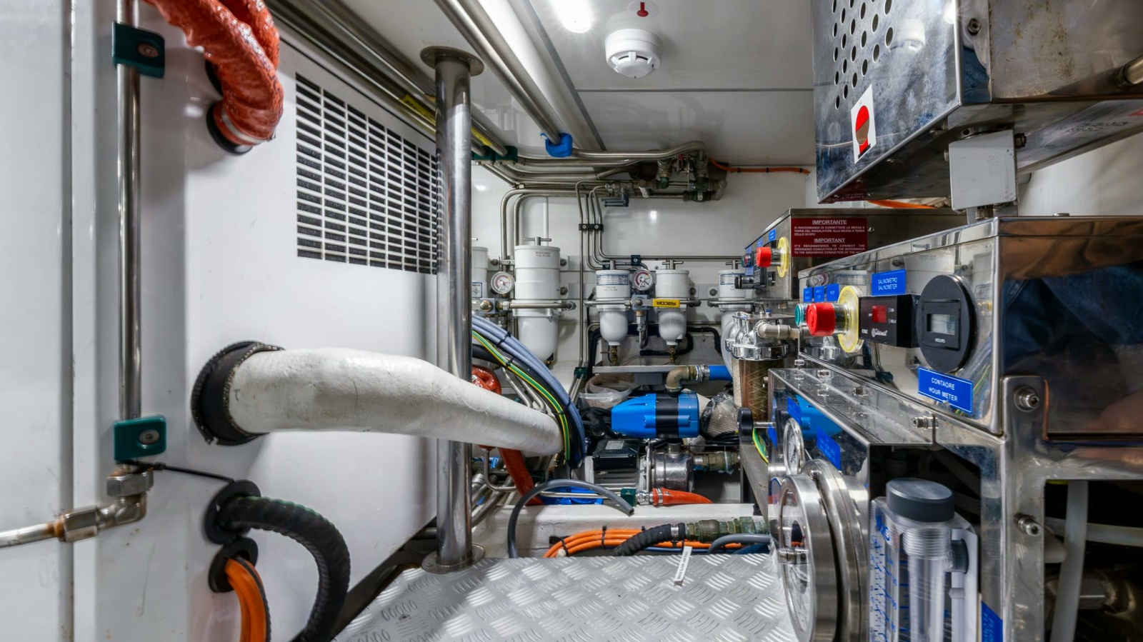 Main engine service alternator equipped with an “on/off” switch in the engine room to stop the alternator charging in case of over-heating.